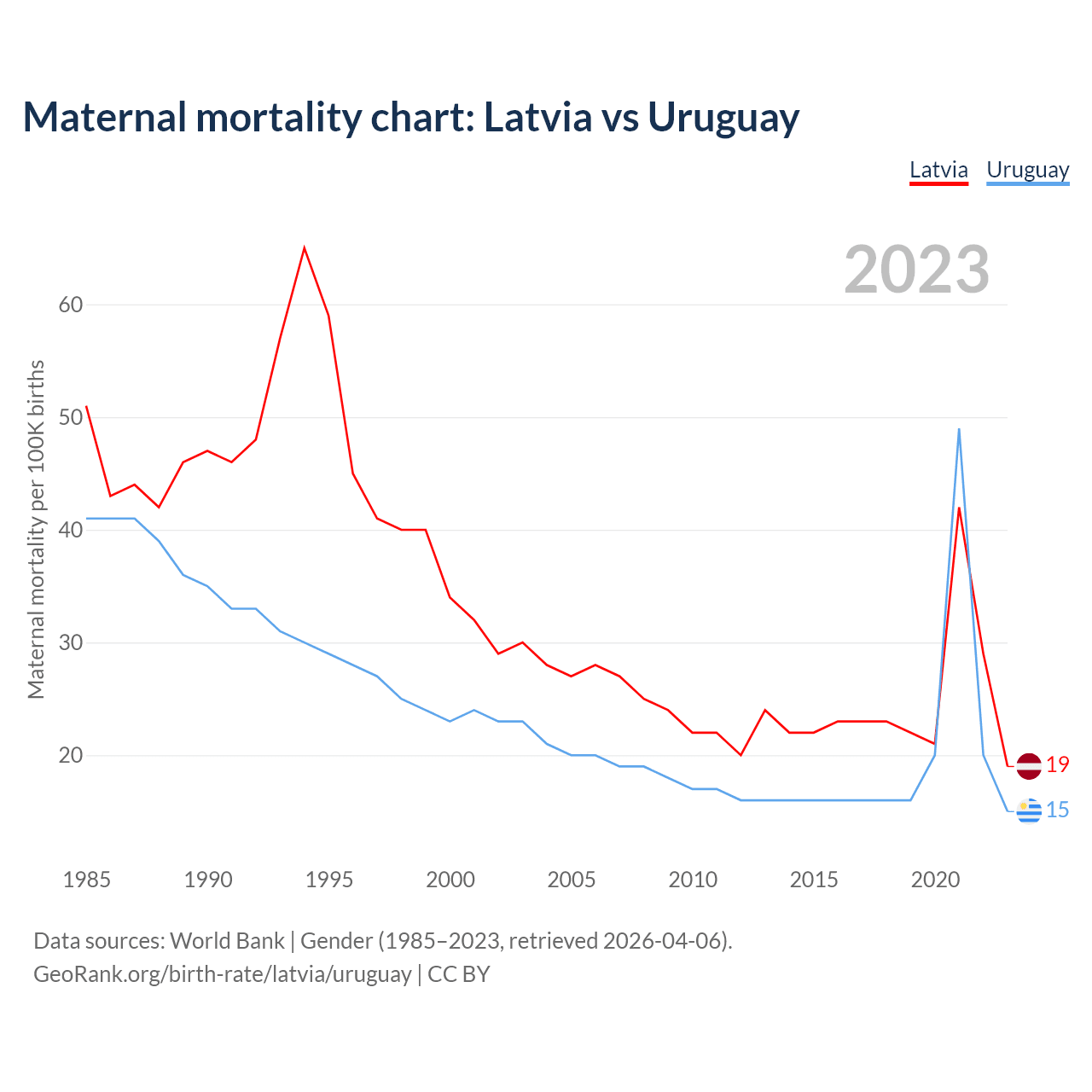 The maternal mortality rate, which is the probability of dying during childbirth or within 42 days of pregnancy termination, is 19 deaths per 100,000 live births in Latvia, compared to 15 deaths in Uruguay.