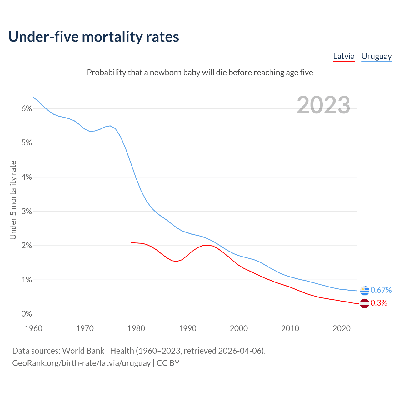 The chance that a newborn baby will die before reaching age five is 0.3% in Latvia and 0.67% in Uruguay. Above is a chart with historical data on under-five mortality rates.