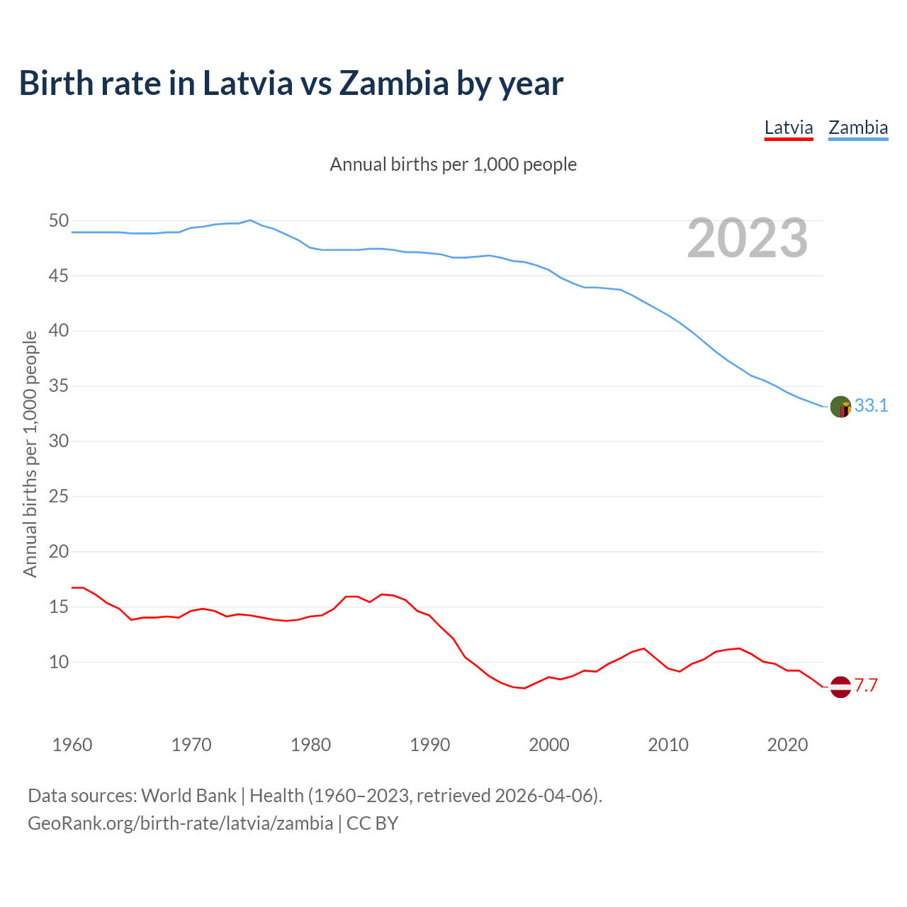 Latvia has an annual birth rate of 7.7 births per 1,000 people, compared to 33.1 for Zambia. The average number of children a woman is expected to have during her lifetime — the fertility rate, is 1.36 in Latvia and 4.1 in Zambia — 201.5% difference.