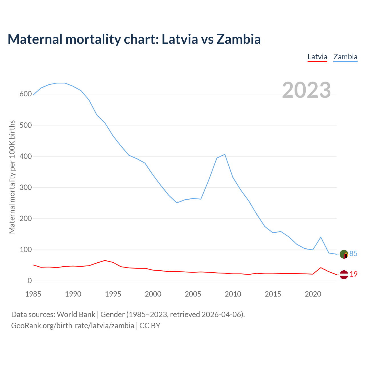 The maternal mortality rate, which is the probability of dying during childbirth or within 42 days of pregnancy termination, is 19 deaths per 100,000 live births in Latvia, compared to 85 deaths in Zambia.