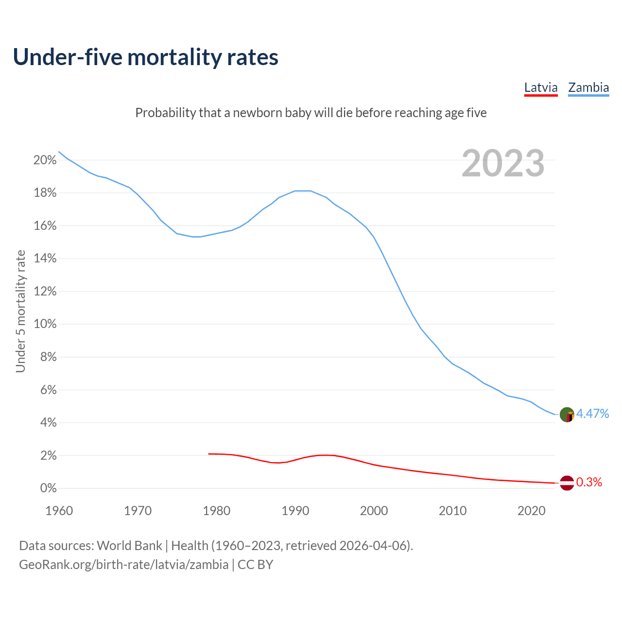 The chance that a newborn baby will die before reaching age five is 0.3% in Latvia and 4.47% in Zambia. Above is a chart with historical data on under-five mortality rates.