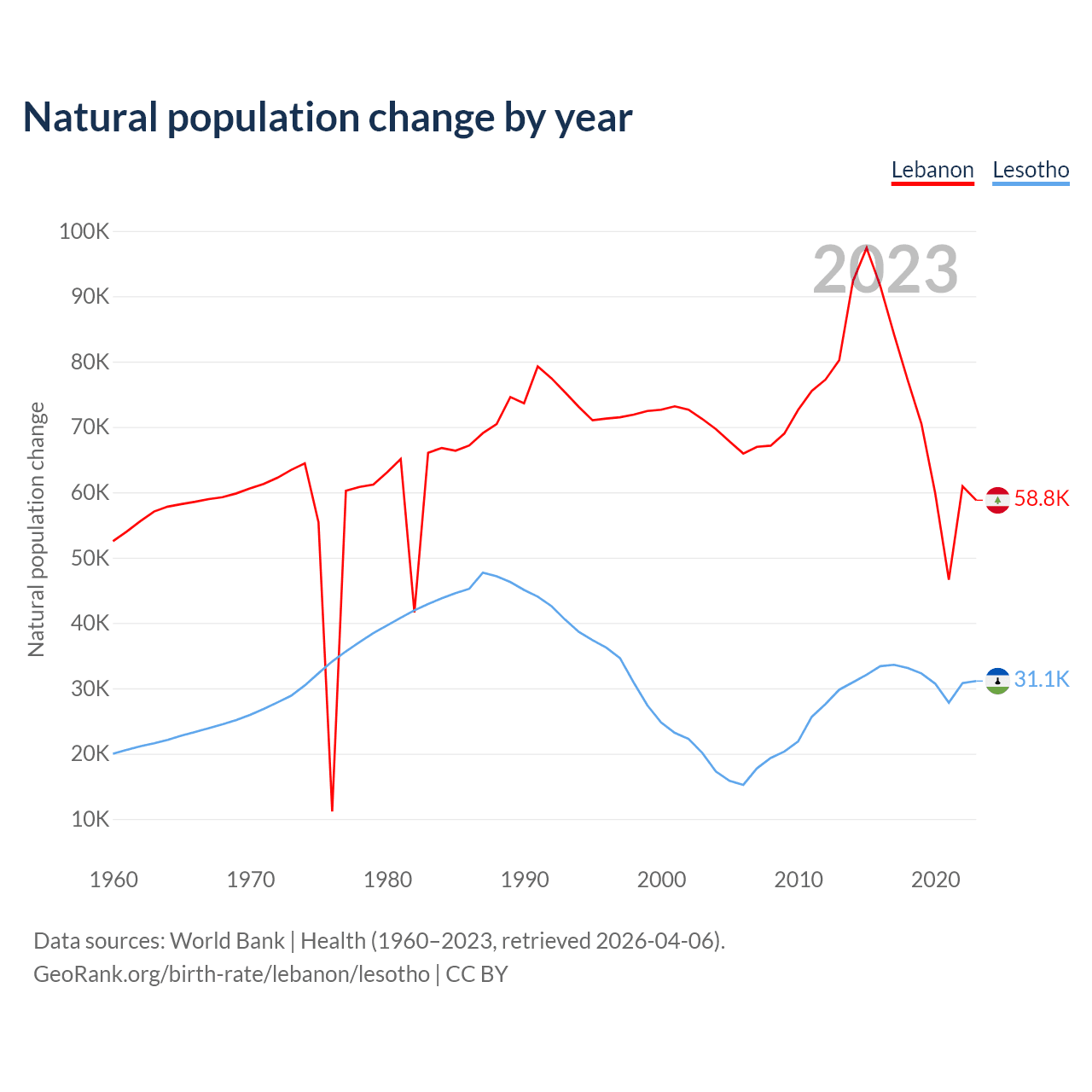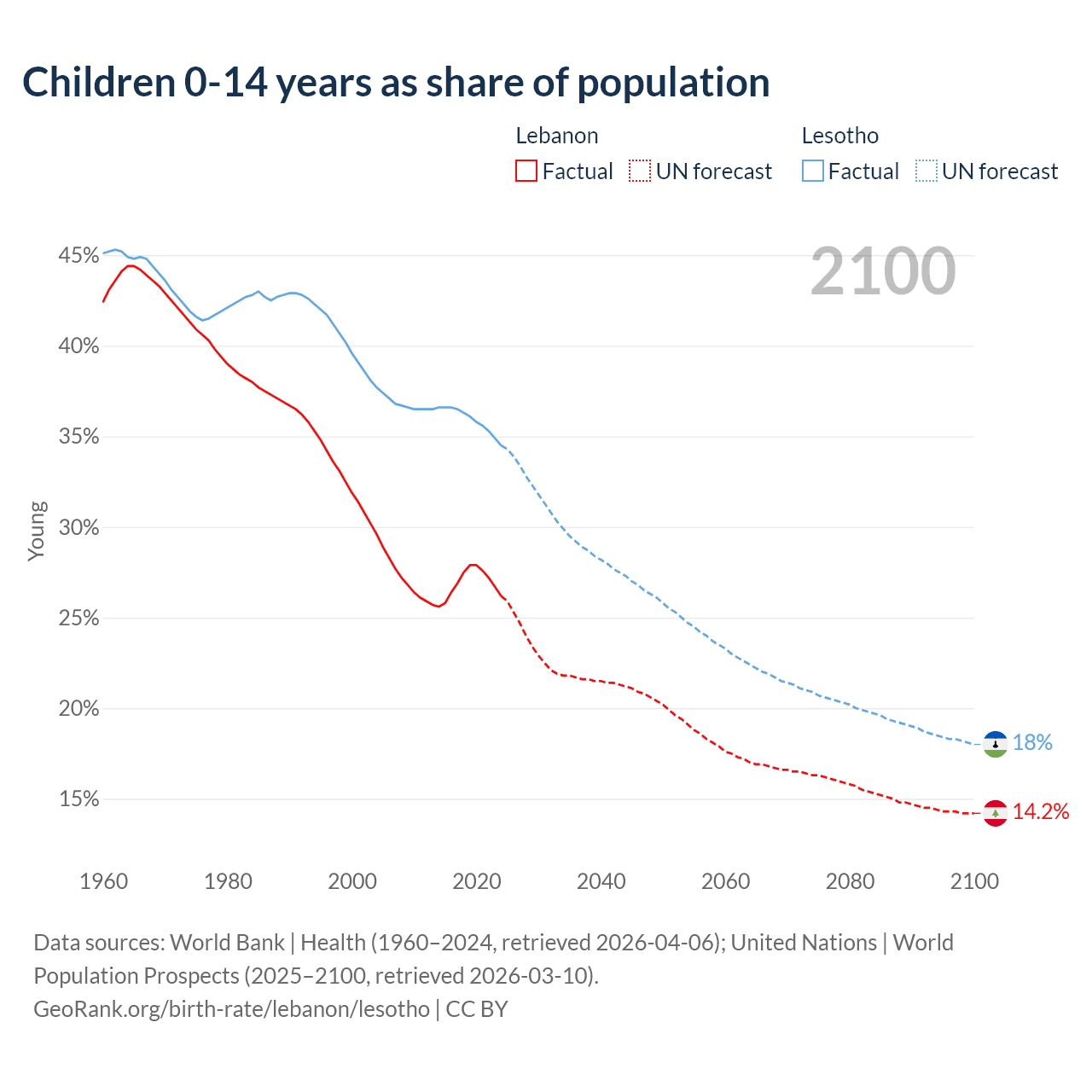 According to the latest available data on birth rates, the fertility rate in Lebanon was 2.24 children per woman in 2023, compared to 2.69 in Lesotho in 2023. The replacement level is considered to be 2.1 children per woman.