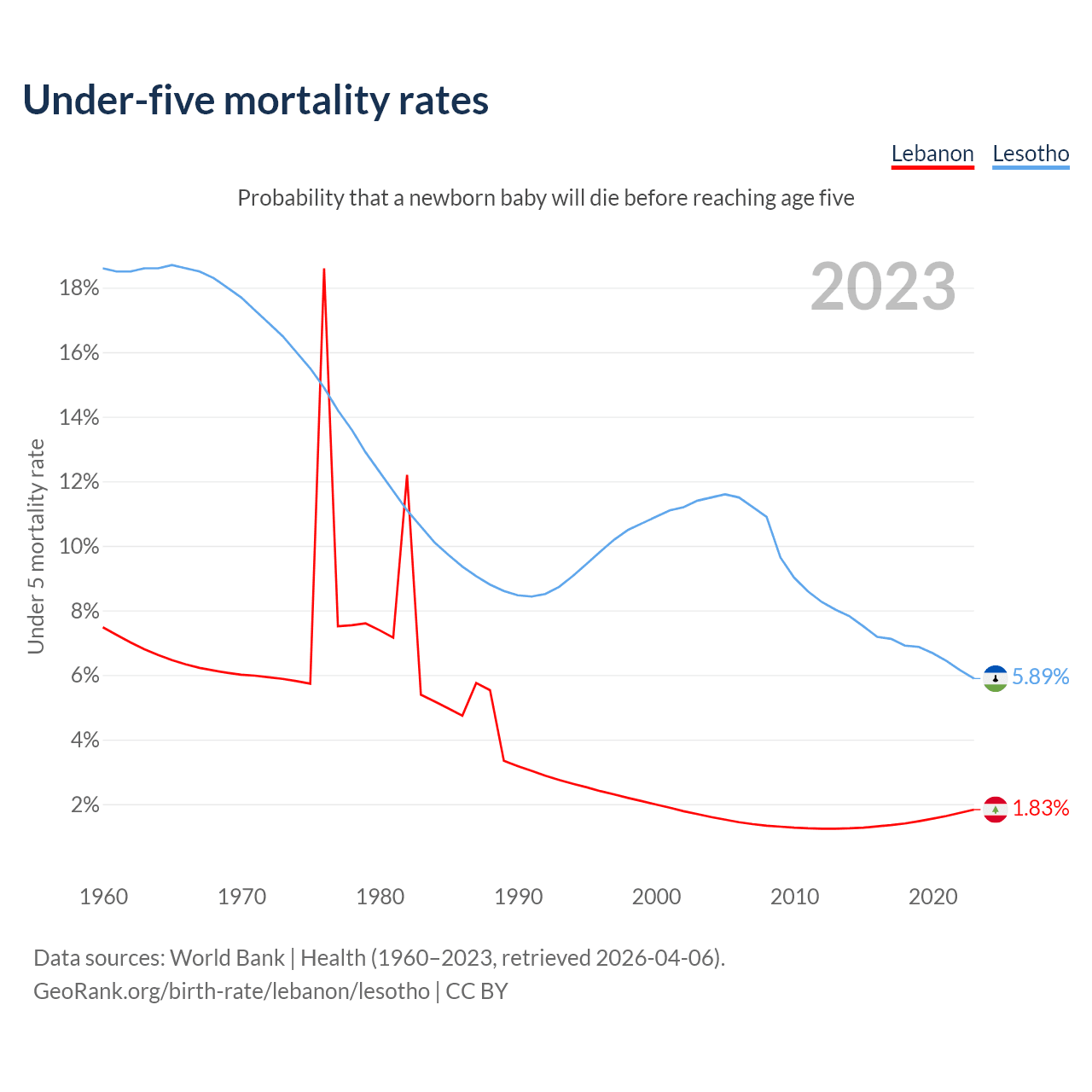 The chance that a newborn baby will die before reaching age five is 1.83% in Lebanon and 5.89% in Lesotho. Above is a chart with historical data on under-five mortality rates.