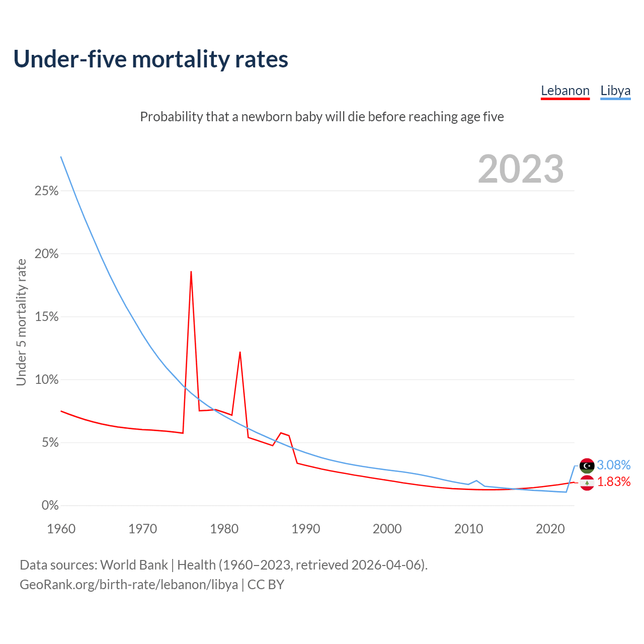 The chance that a newborn baby will die before reaching age five is 1.83% in Lebanon and 3.08% in Libya. Above is a chart with historical data on under-five mortality rates.