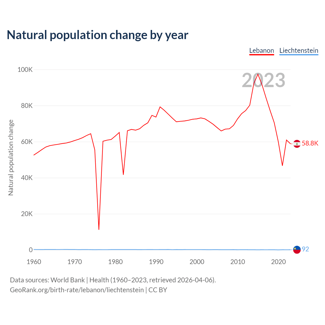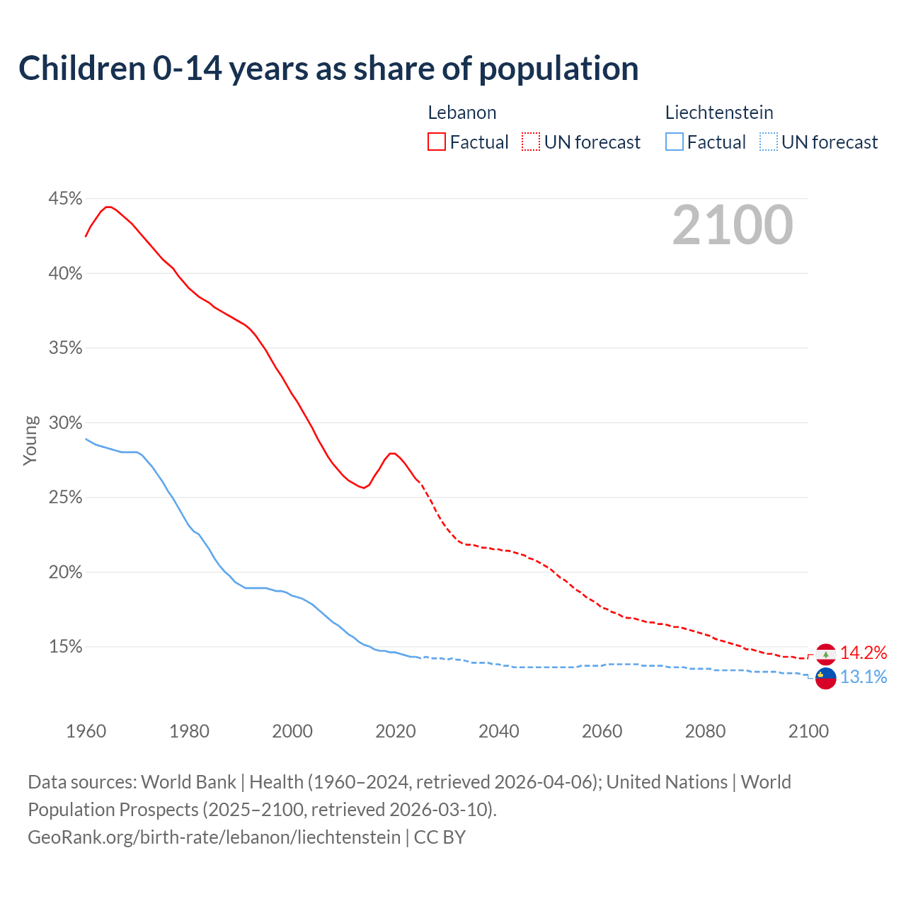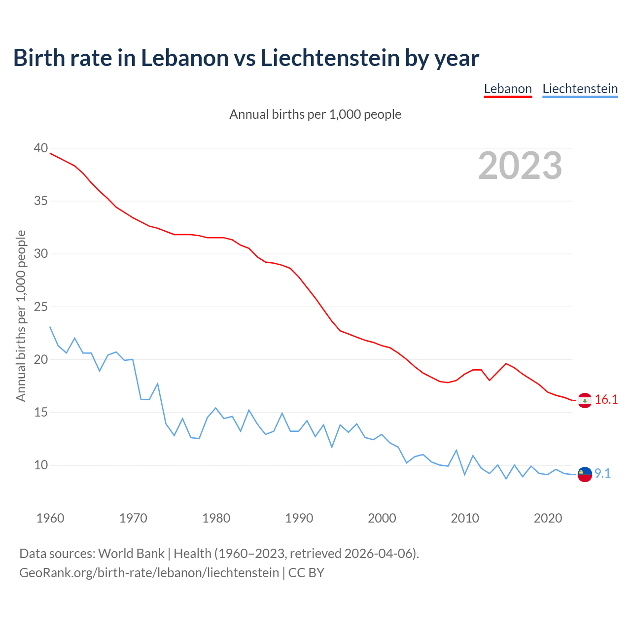 According to the latest available data on birth rates, the fertility rate in Lebanon was 2.24 children per woman in 2023, compared to 1.45 in Liechtenstein in 2023. The replacement level is considered to be 2.1 children per woman.