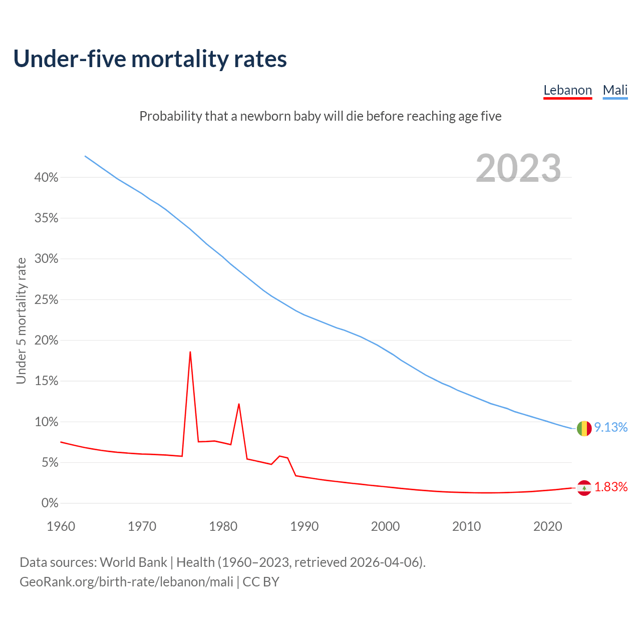 The chance that a newborn baby will die before reaching age five is 1.83% in Lebanon and 9.13% in Mali. Above is a chart with historical data on under-five mortality rates.