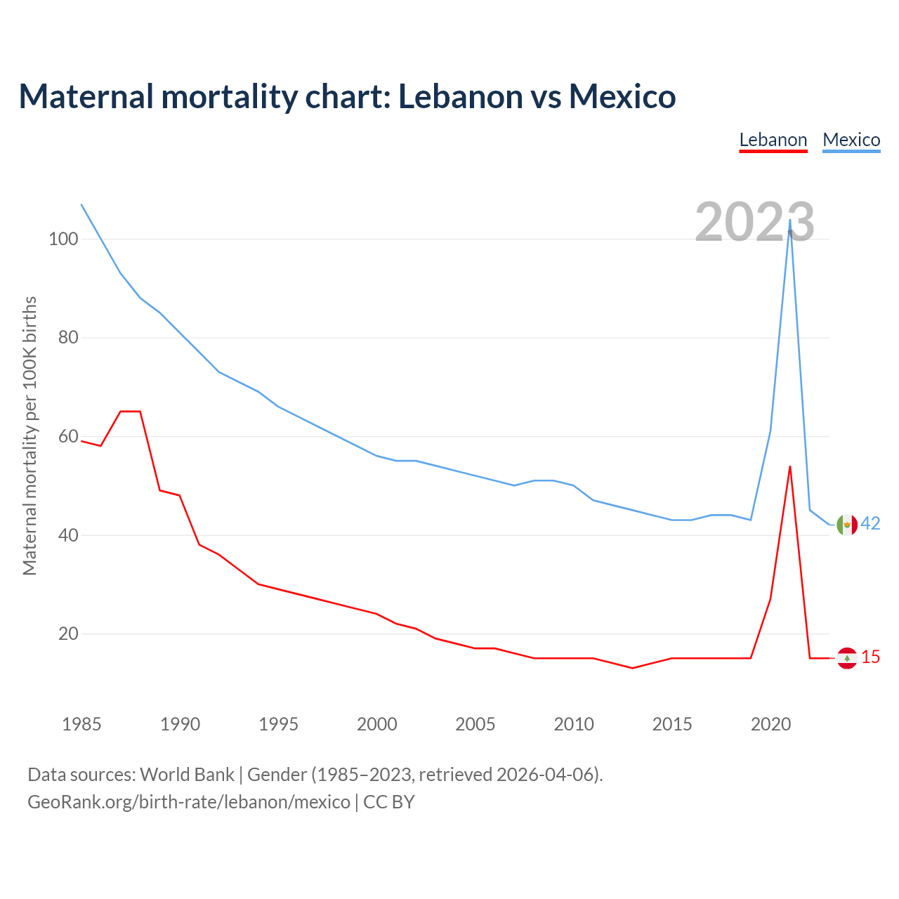 The maternal mortality rate, which is the probability of dying during childbirth or within 42 days of pregnancy termination, is 15 deaths per 100,000 live births in Lebanon, compared to 42 deaths in Mexico.