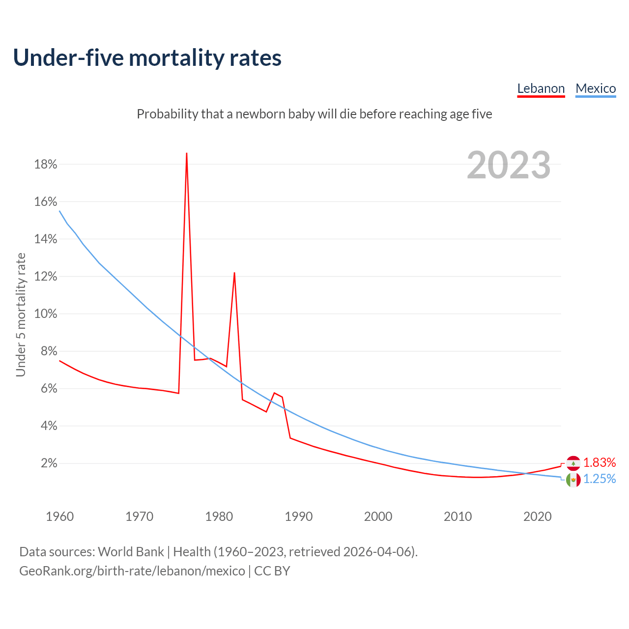 The chance that a newborn baby will die before reaching age five is 1.83% in Lebanon and 1.25% in Mexico. Above is a chart with historical data on under-five mortality rates.