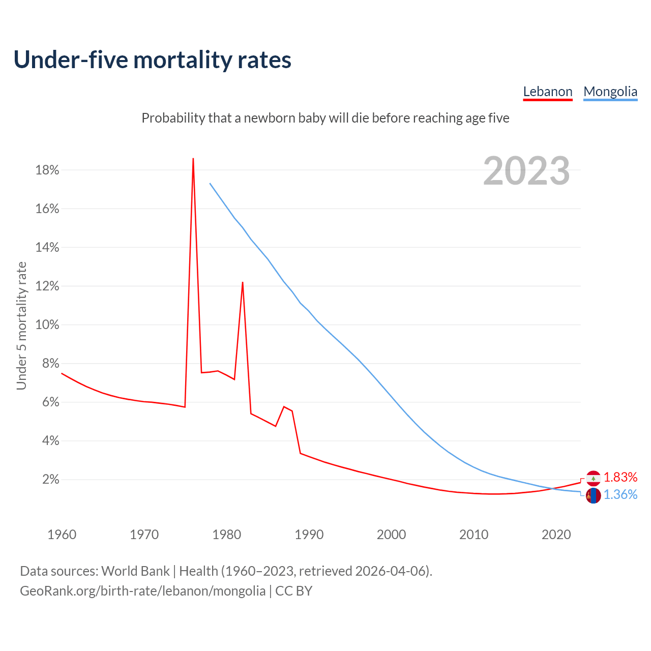 The chance that a newborn baby will die before reaching age five is 1.83% in Lebanon and 1.36% in Mongolia. Above is a chart with historical data on under-five mortality rates.