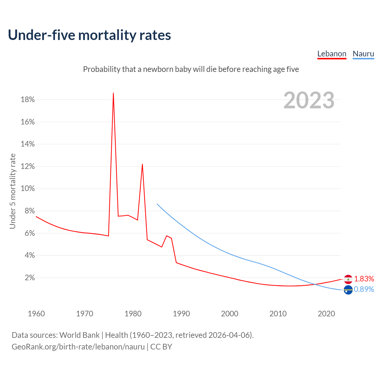 The chance that a newborn baby will die before reaching age five is 1.83% in Lebanon and 0.89% in Nauru. Above is a chart with historical data on under-five mortality rates.