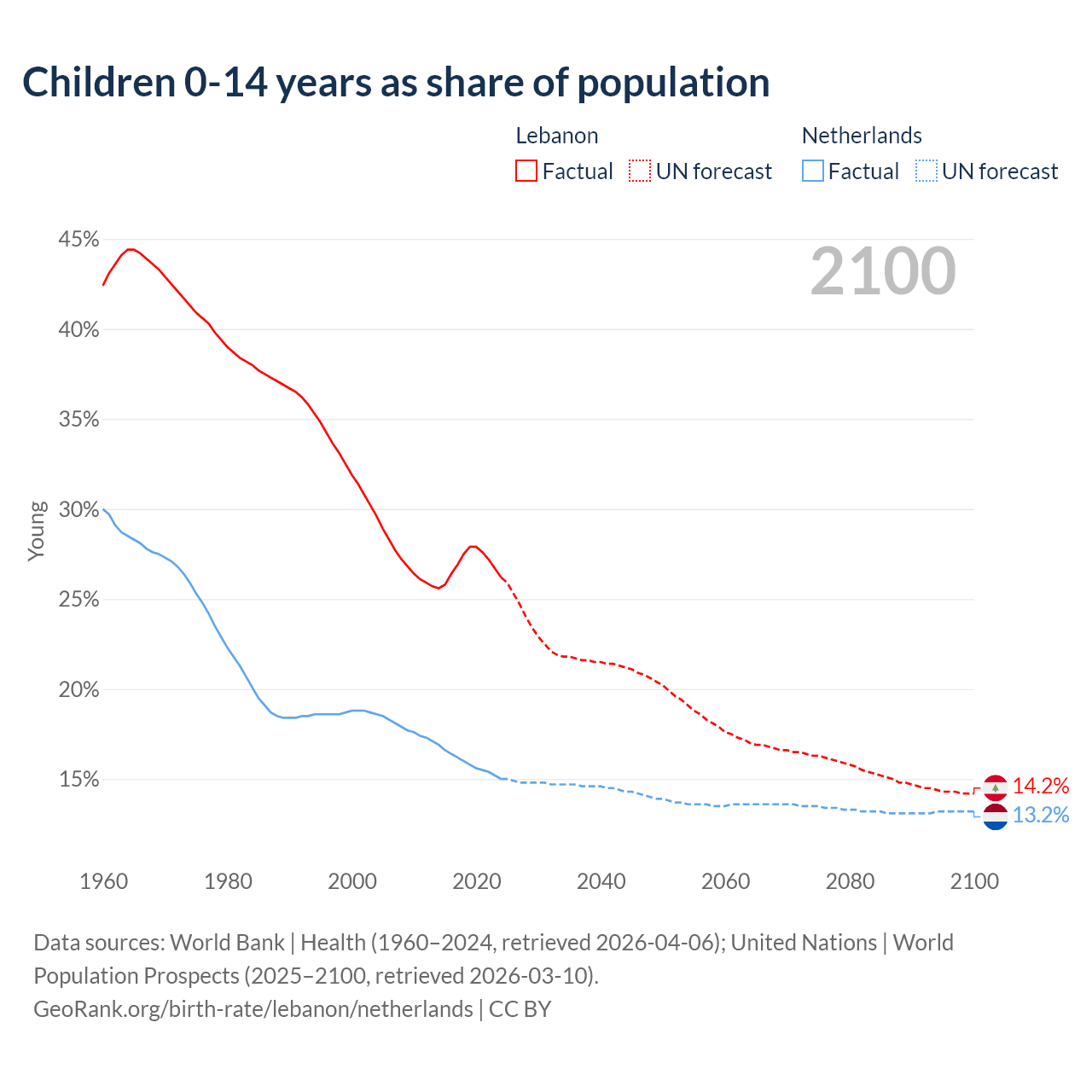 According to the latest available data on birth rates, the fertility rate in Lebanon was 2.24 children per woman in 2023, compared to 1.43 in the Netherlands in 2023. The replacement level is considered to be 2.1 children per woman.