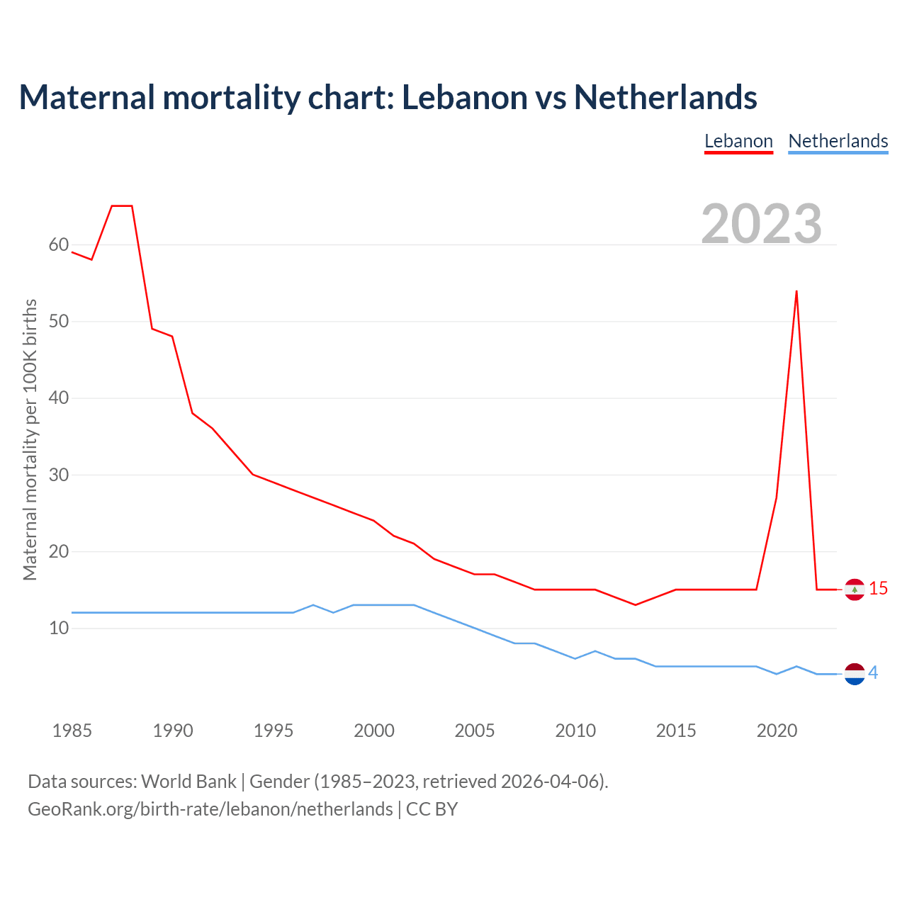 The maternal mortality rate, which is the probability of dying during childbirth or within 42 days of pregnancy termination, is 15 deaths per 100,000 live births in Lebanon, compared to 4 deaths in the Netherlands.
