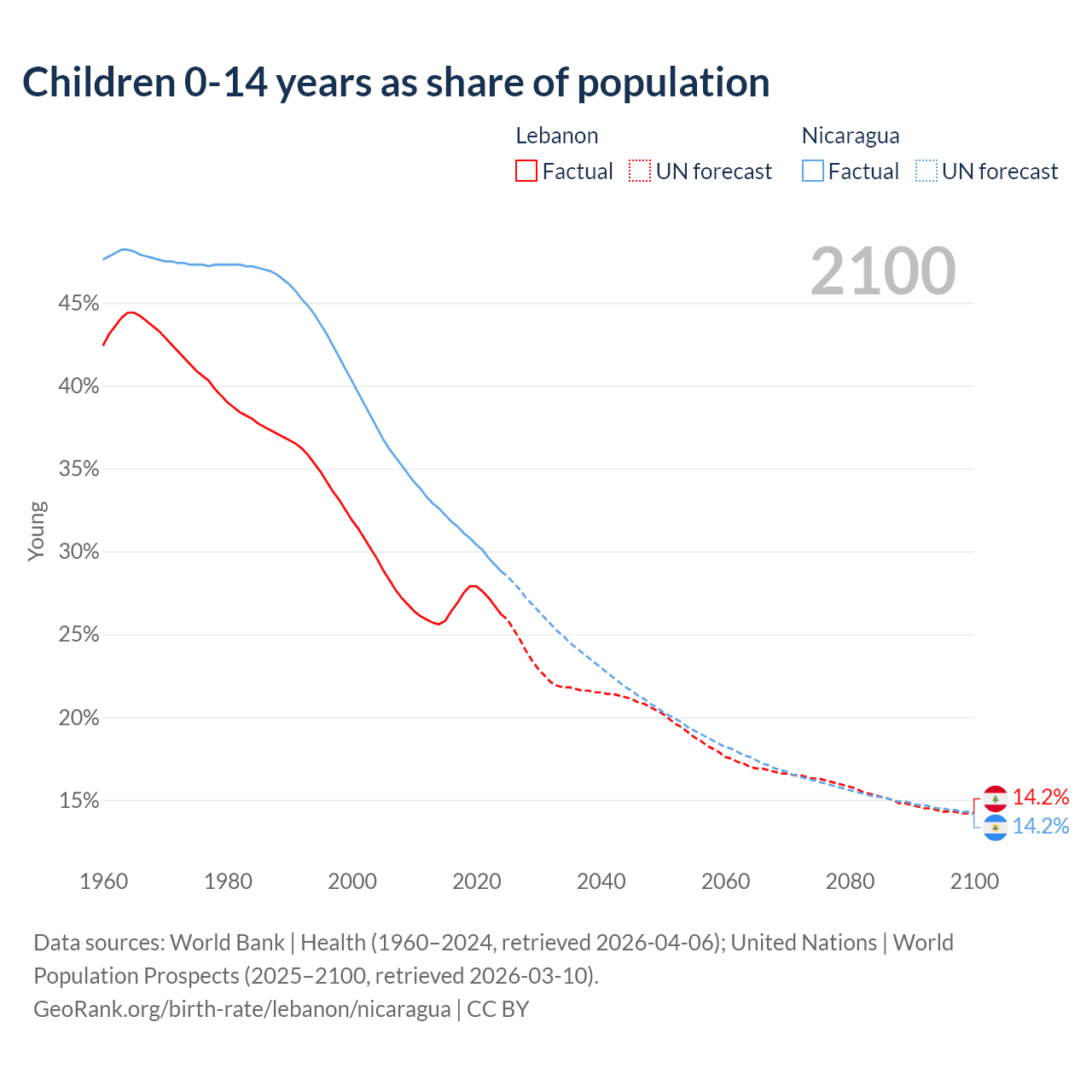 According to the latest available data on birth rates, the fertility rate in Lebanon was 2.24 children per woman in 2023, compared to 2.22 in Nicaragua in 2023. The replacement level is considered to be 2.1 children per woman.