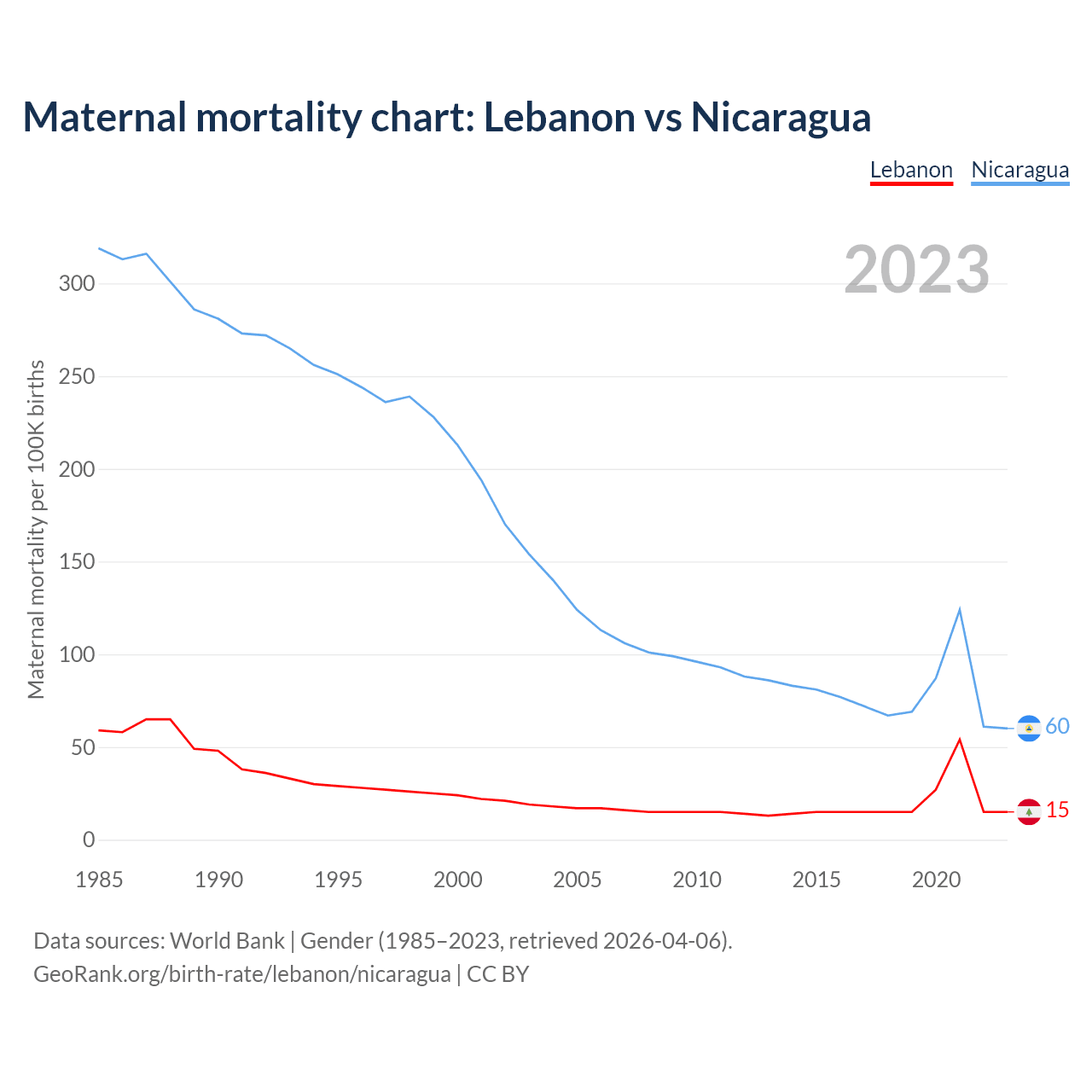 The maternal mortality rate, which is the probability of dying during childbirth or within 42 days of pregnancy termination, is 15 deaths per 100,000 live births in Lebanon, compared to 60 deaths in Nicaragua.