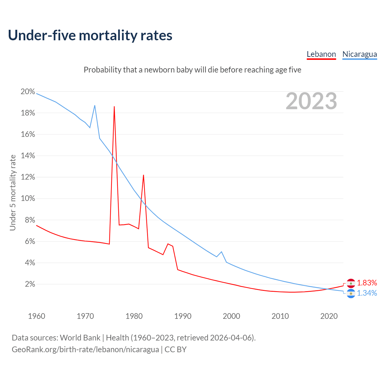 The chance that a newborn baby will die before reaching age five is 1.83% in Lebanon and 1.34% in Nicaragua. Above is a chart with historical data on under-five mortality rates.