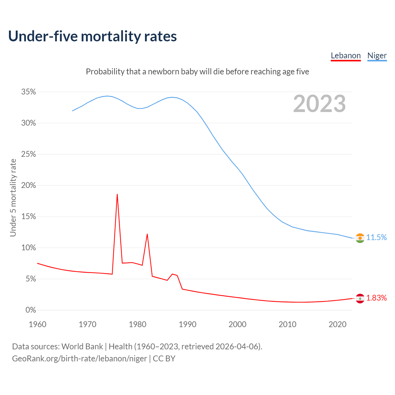 The chance that a newborn baby will die before reaching age five is 1.83% in Lebanon and 11.5% in Niger. Above is a chart with historical data on under-five mortality rates.