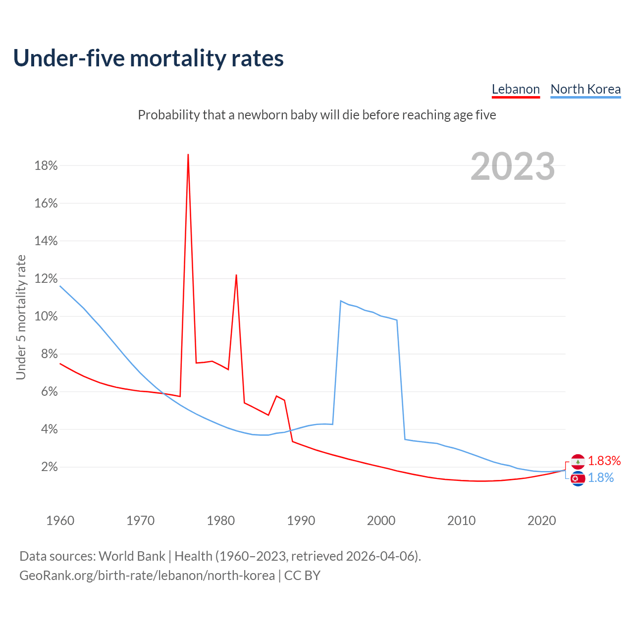 The chance that a newborn baby will die before reaching age five is 1.83% in Lebanon and 1.8% in North Korea. Above is a chart with historical data on under-five mortality rates.