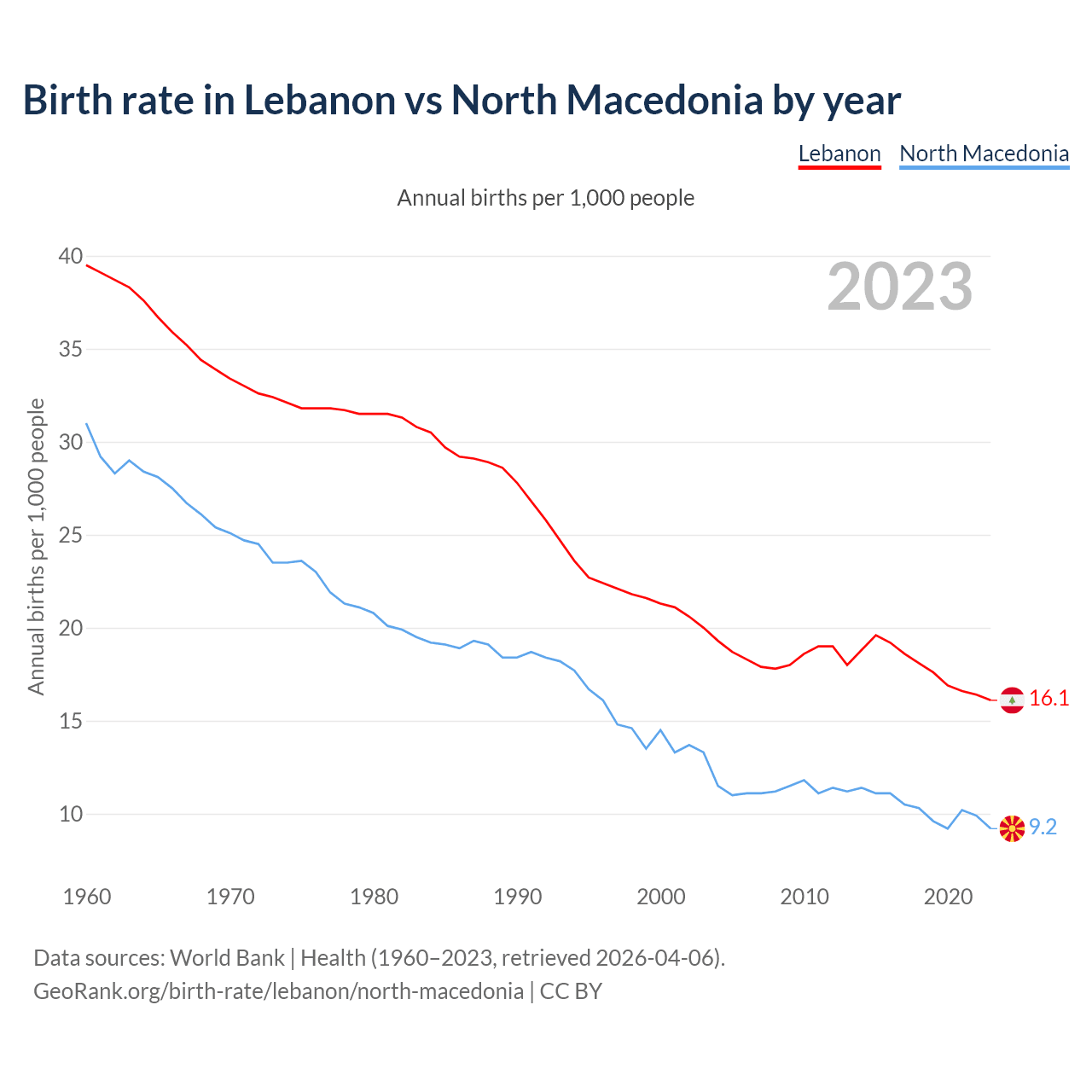- Lebanon is ranked 94/196 by birth rate compared to 158/196 for North Macedonia.