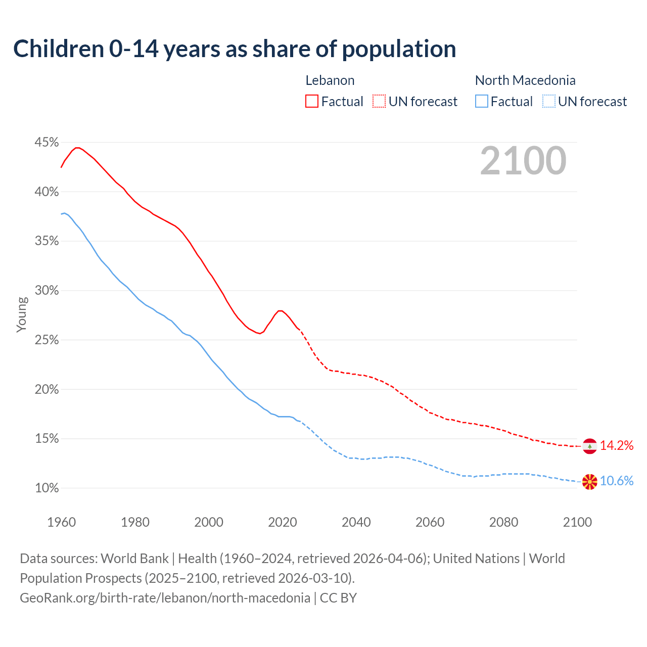 Lebanon has an annual birth rate of 16.1 births per 1,000 people, compared to 9.2 for North Macedonia. The average number of children a woman is expected to have during her lifetime — the fertility rate, is 2.24 in Lebanon and 1.5 in North Macedonia — 33% difference.