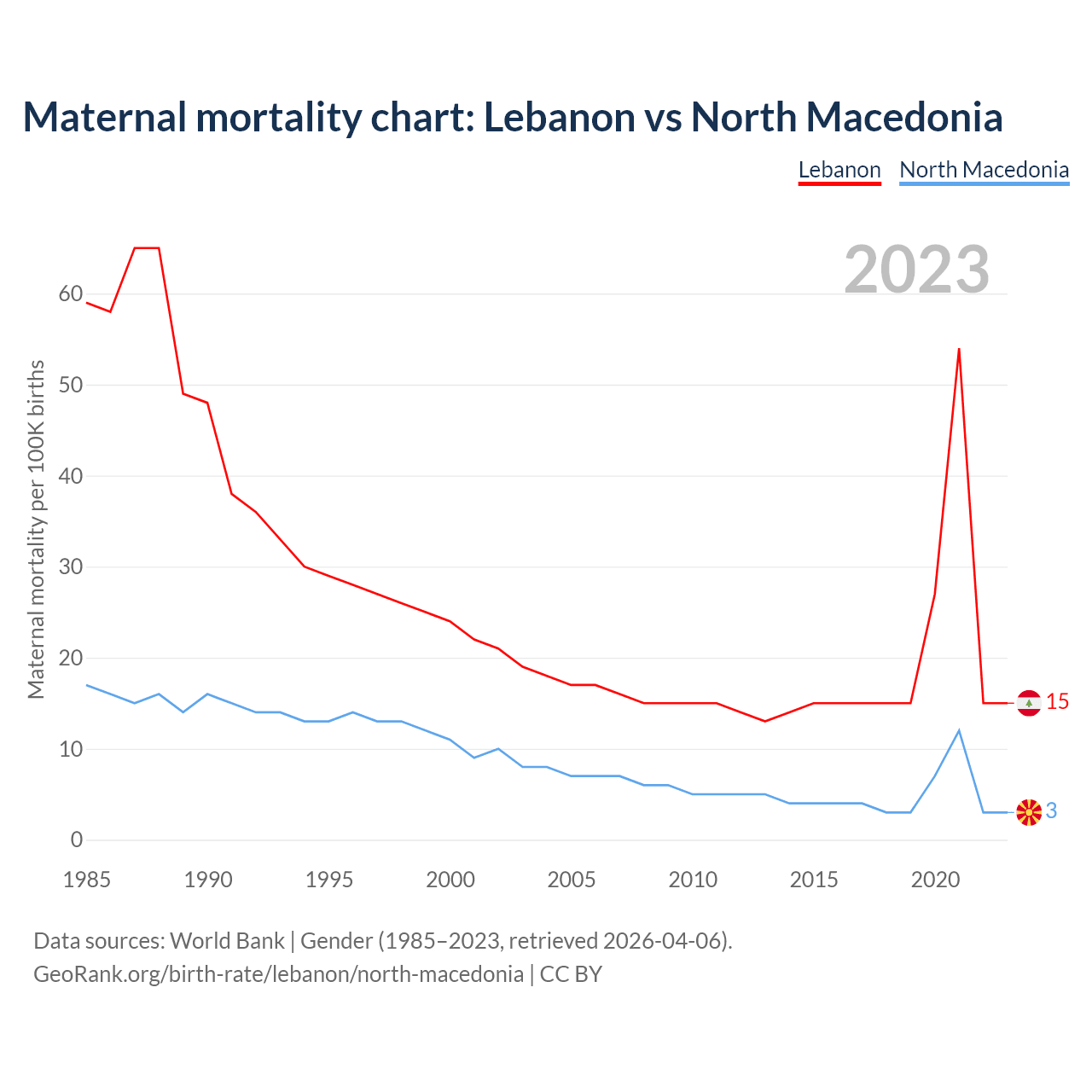 The maternal mortality rate, which is the probability of dying during childbirth or within 42 days of pregnancy termination, is 15 deaths per 100,000 live births in Lebanon, compared to 3 deaths in North Macedonia.