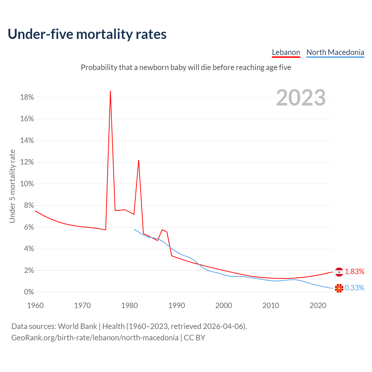 The chance that a newborn baby will die before reaching age five is 1.83% in Lebanon and 0.33% in North Macedonia. Above is a chart with historical data on under-five mortality rates.