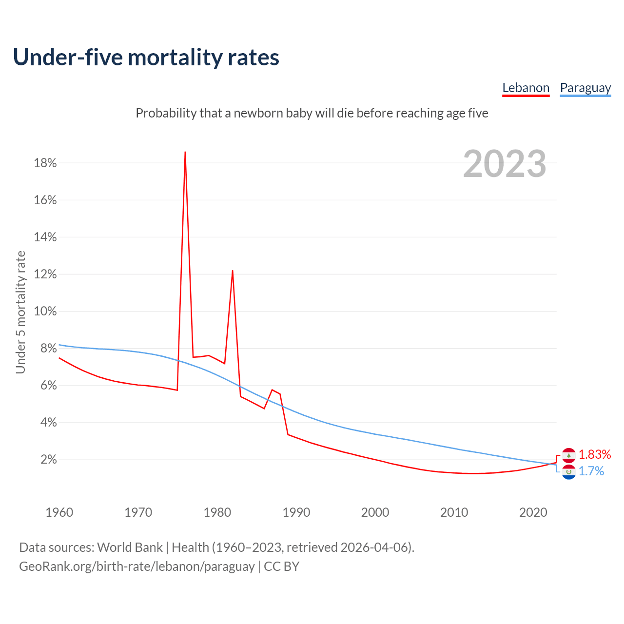 The chance that a newborn baby will die before reaching age five is 1.83% in Lebanon and 1.7% in Paraguay. Above is a chart with historical data on under-five mortality rates.
