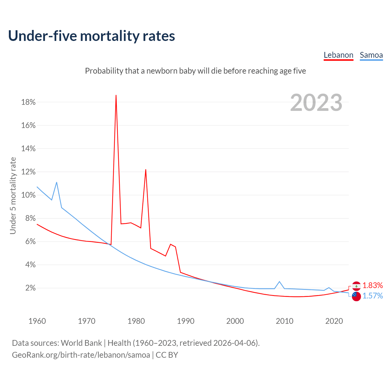The chance that a newborn baby will die before reaching age five is 1.83% in Lebanon and 1.57% in Samoa. Above is a chart with historical data on under-five mortality rates.
