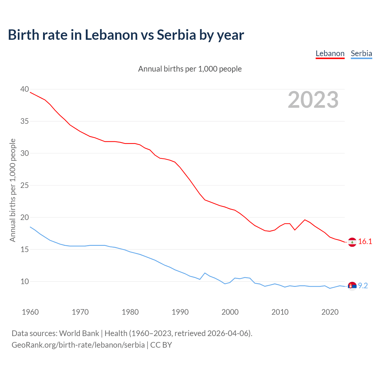Lebanon has an annual birth rate of 16.1 births per 1,000 people, compared to 9.2 for Serbia. The average number of children a woman is expected to have during her lifetime — the fertility rate, is 2.24 in Lebanon and 1.61 in Serbia — 28.1% difference.