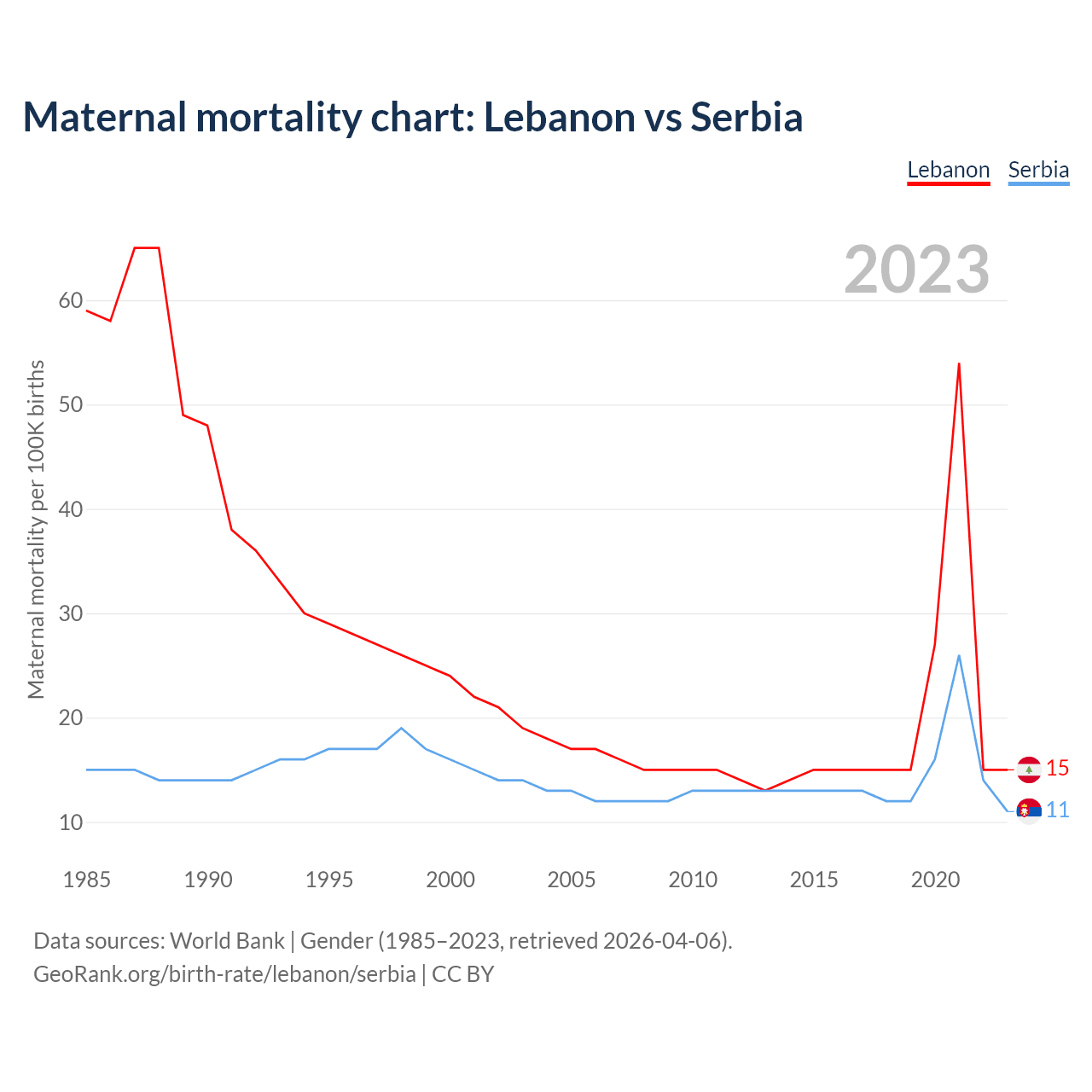 The maternal mortality rate, which is the probability of dying during childbirth or within 42 days of pregnancy termination, is 15 deaths per 100,000 live births in Lebanon, compared to 11 deaths in Serbia.