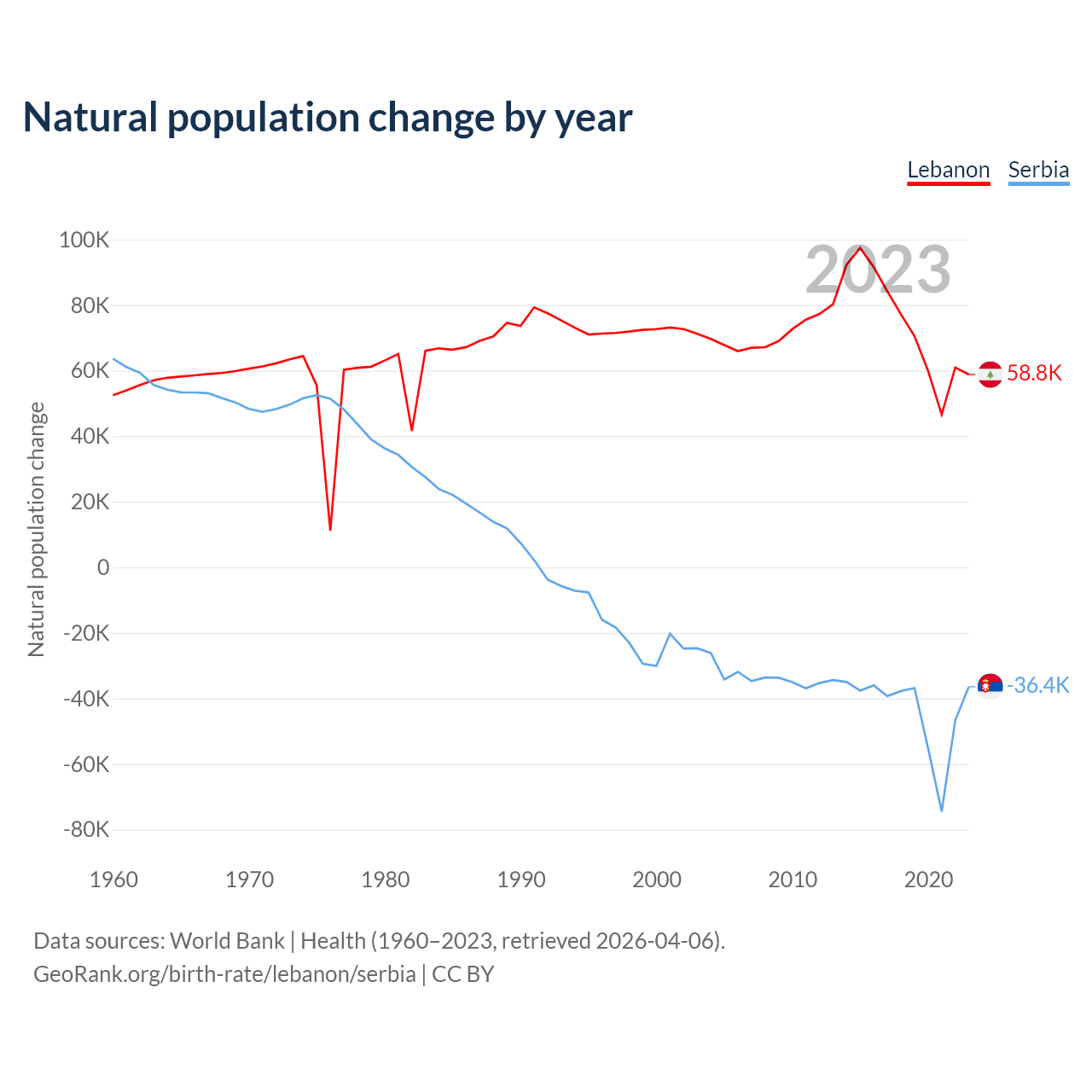 - Lebanon is ranked 94/196 by birth rate compared to 159/196 for Serbia.