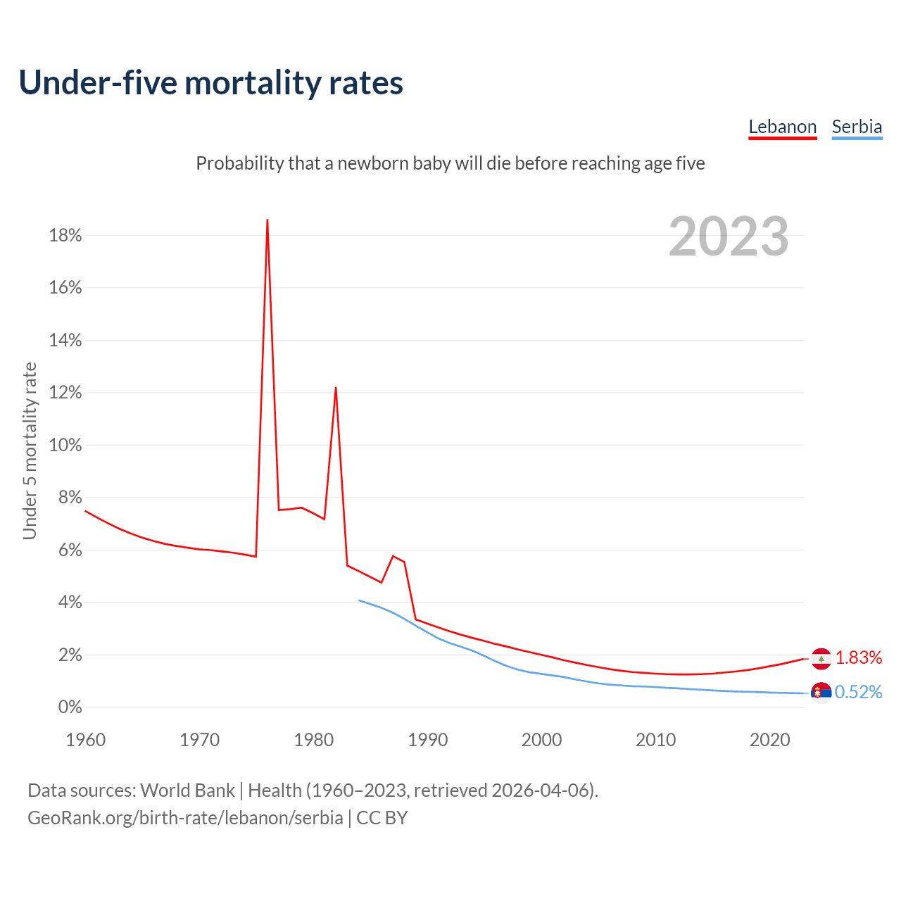 The chance that a newborn baby will die before reaching age five is 1.83% in Lebanon and 0.52% in Serbia. Above is a chart with historical data on under-five mortality rates.