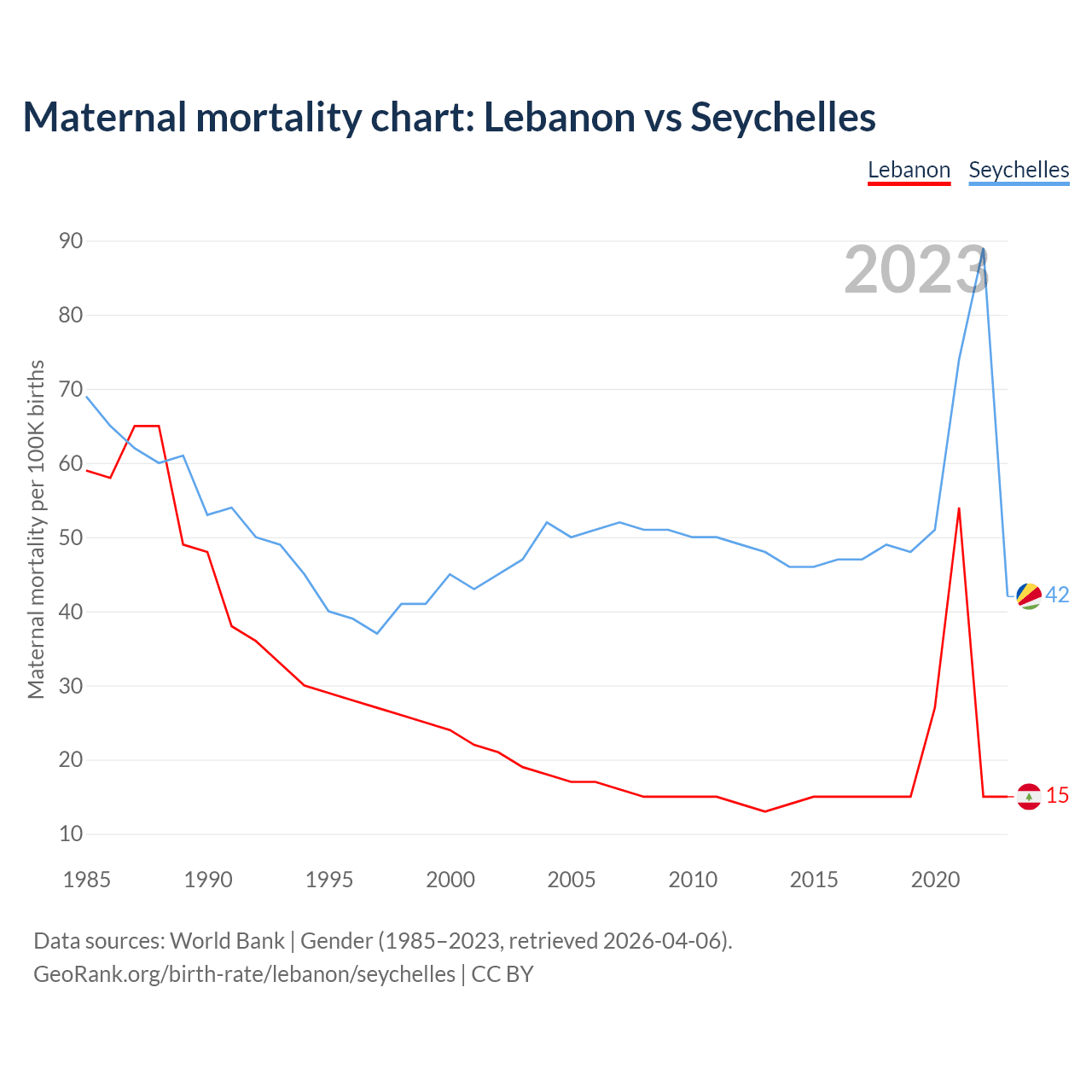 The maternal mortality rate, which is the probability of dying during childbirth or within 42 days of pregnancy termination, is 15 deaths per 100,000 live births in Lebanon, compared to 42 deaths in the Seychelles.