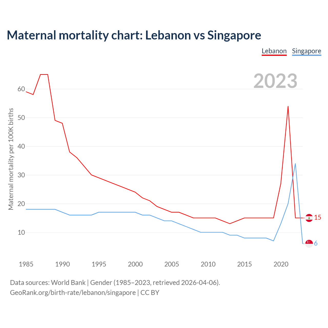 The maternal mortality rate, which is the probability of dying during childbirth or within 42 days of pregnancy termination, is 15 deaths per 100,000 live births in Lebanon, compared to 6 deaths in Singapore.