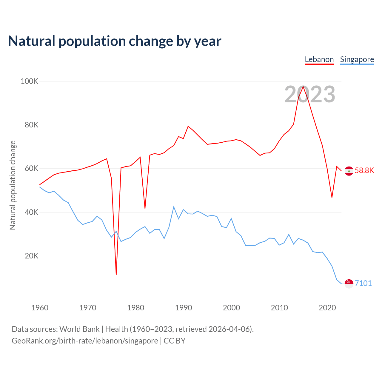 According to the latest available data on birth rates, the fertility rate in Lebanon was 2.24 children per woman in 2023, compared to 0.97 in Singapore in 2023. The replacement level is considered to be 2.1 children per woman.