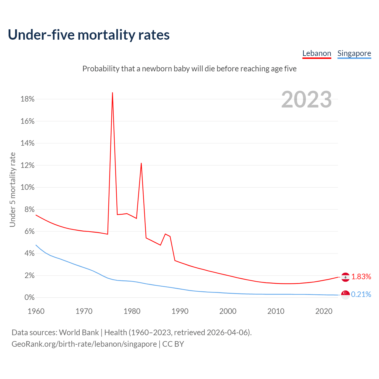 The chance that a newborn baby will die before reaching age five is 1.83% in Lebanon and 0.21% in Singapore. Above is a chart with historical data on under-five mortality rates.