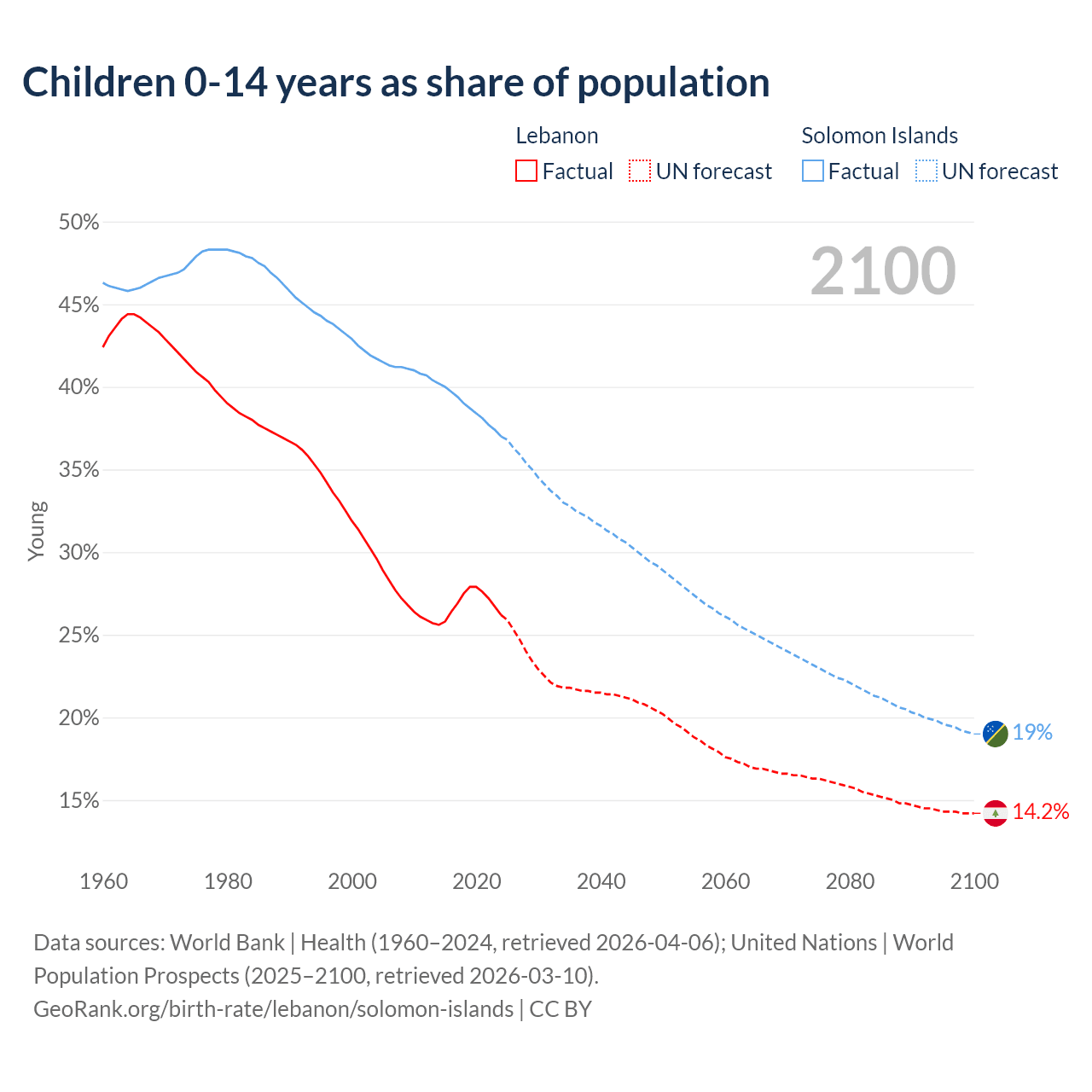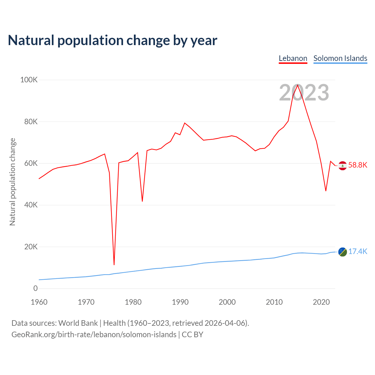 Lebanon has an annual birth rate of 16.1 births per 1,000 people, compared to 26.9 for the Solomon Islands. The average number of children a woman is expected to have during her lifetime — the fertility rate, is 2.24 in Lebanon and 3.56 in the Solomon Islands — 58.9% difference.