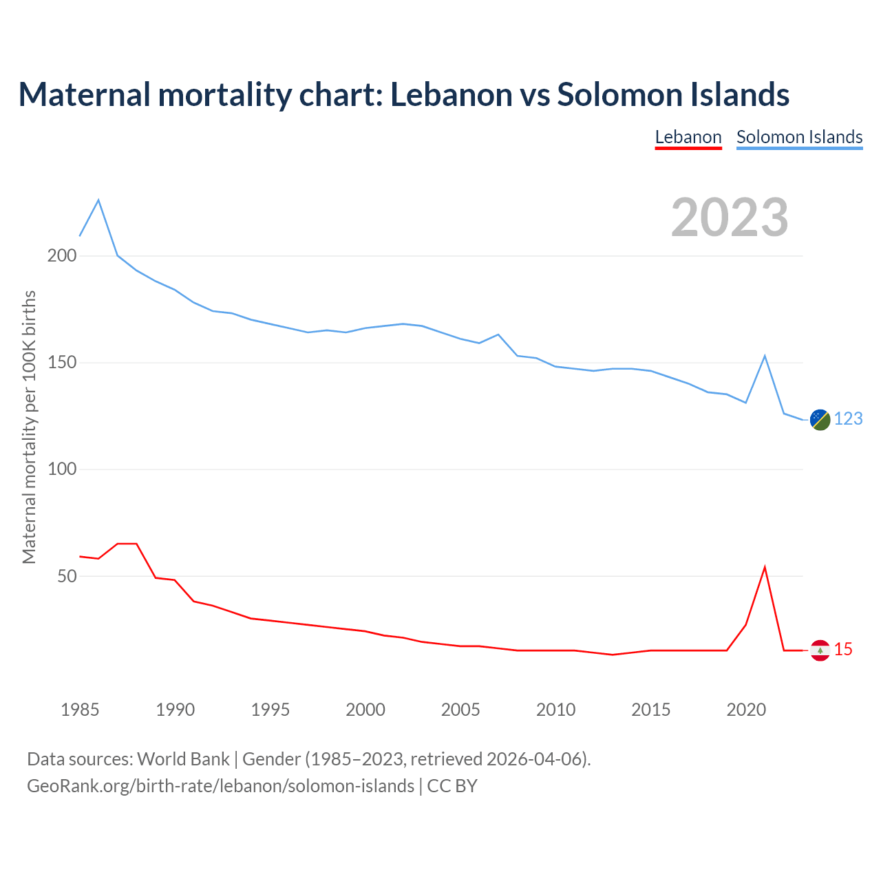 The maternal mortality rate, which is the probability of dying during childbirth or within 42 days of pregnancy termination, is 15 deaths per 100,000 live births in Lebanon, compared to 123 deaths in the Solomon Islands.