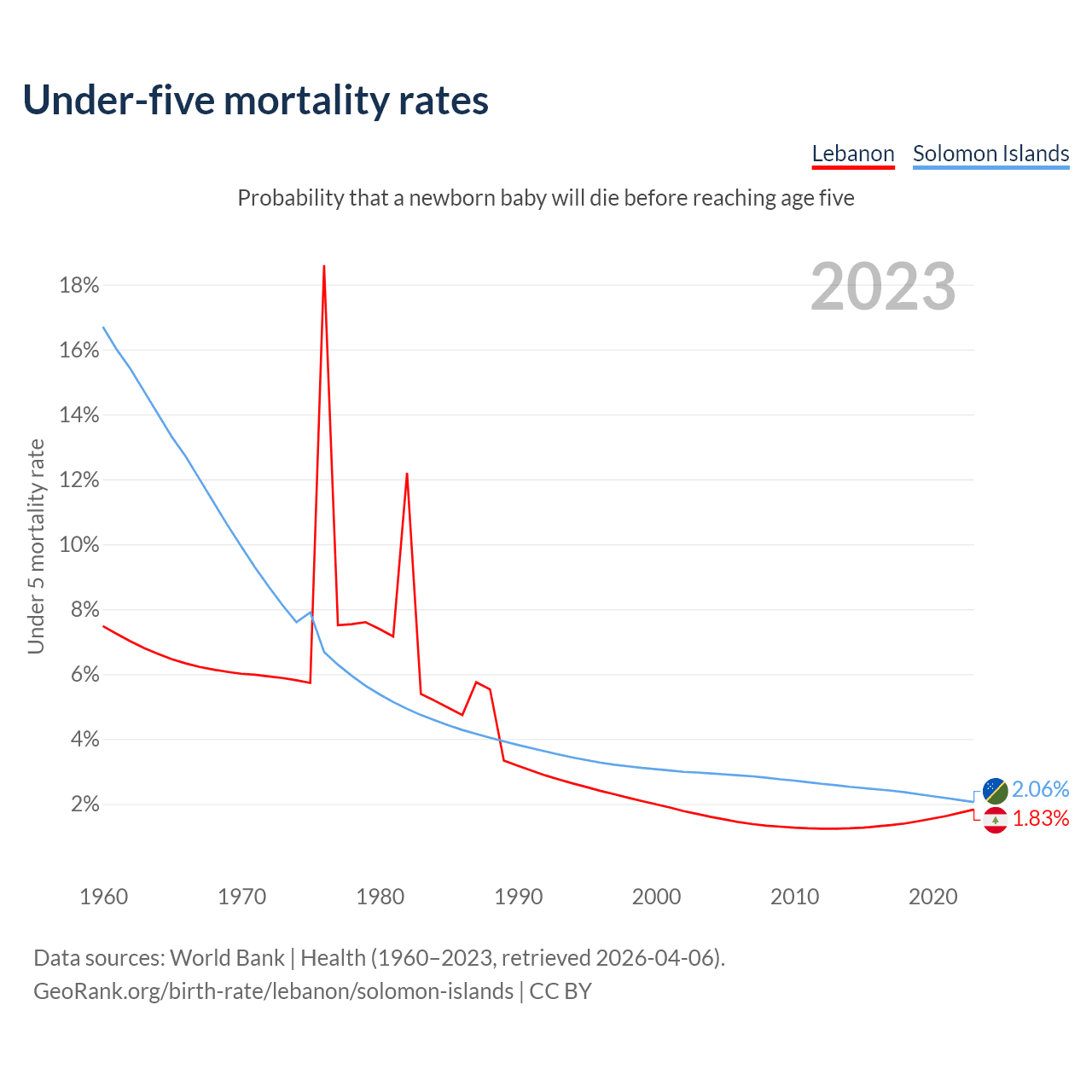 The chance that a newborn baby will die before reaching age five is 1.83% in Lebanon and 2.06% in the Solomon Islands. Above is a chart with historical data on under-five mortality rates.