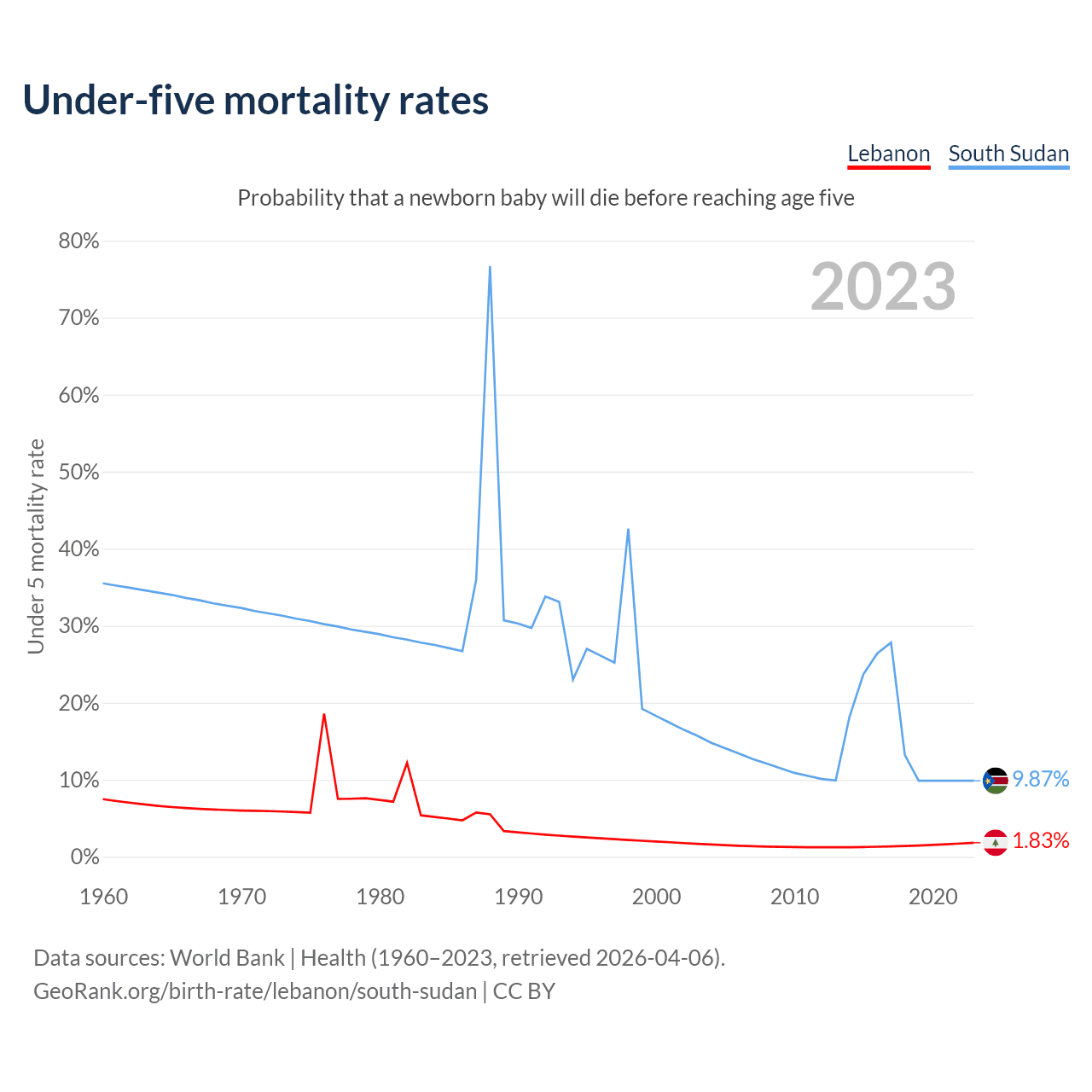 The chance that a newborn baby will die before reaching age five is 1.83% in Lebanon and 9.87% in South Sudan. Above is a chart with historical data on under-five mortality rates.