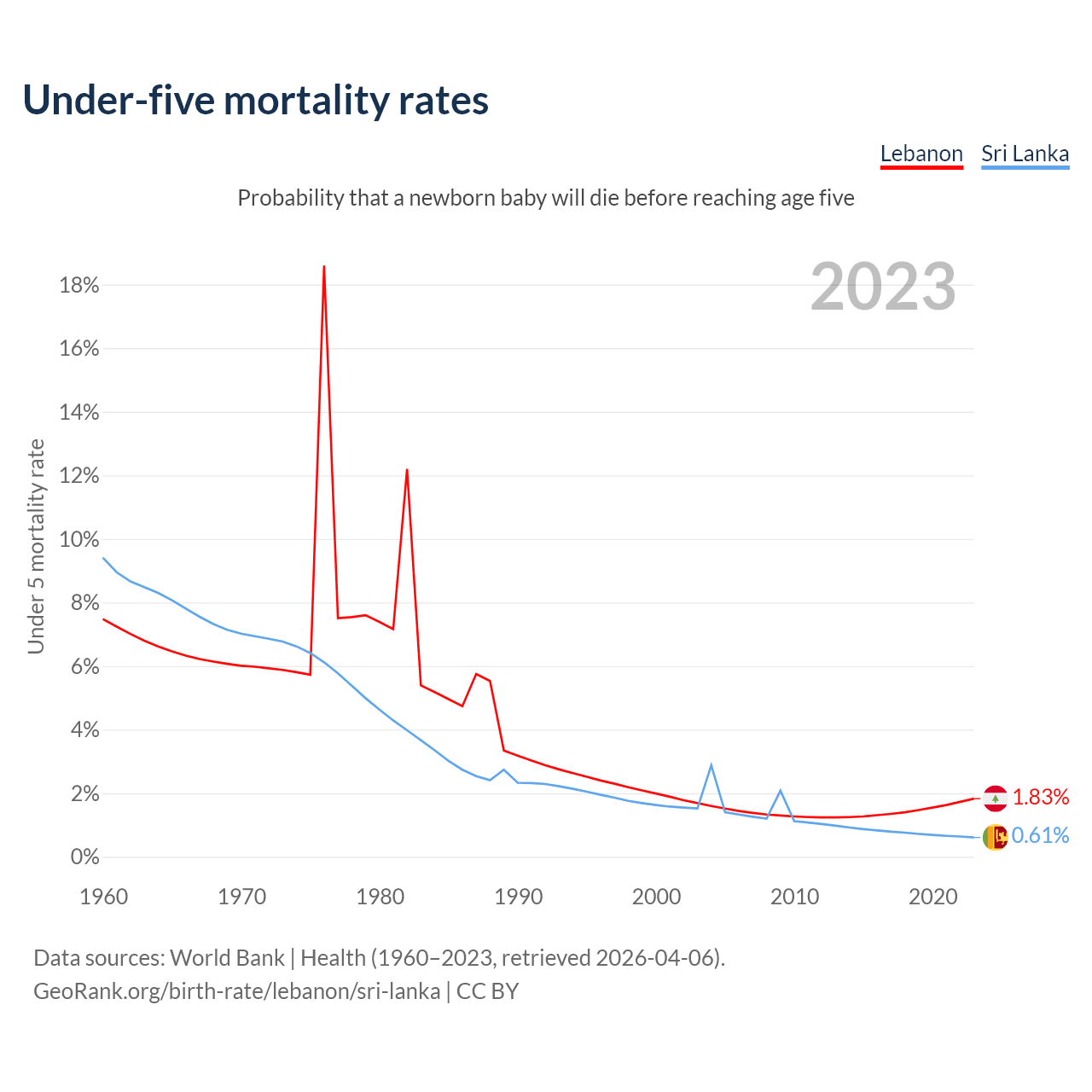 The chance that a newborn baby will die before reaching age five is 1.83% in Lebanon and 0.61% in Sri Lanka. Above is a chart with historical data on under-five mortality rates.