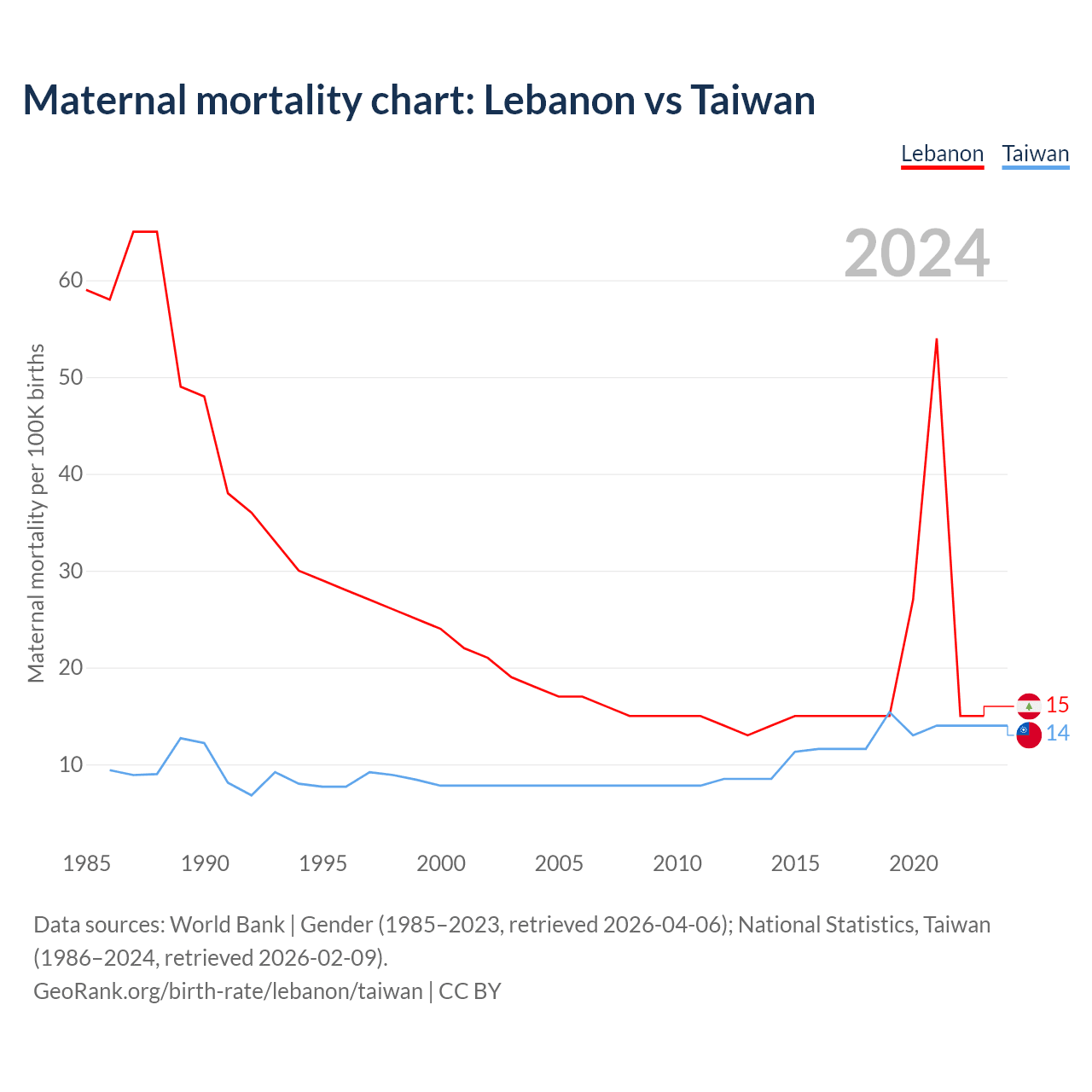 The maternal mortality rate, which is the probability of dying during childbirth or within 42 days of pregnancy termination, is 15 deaths per 100,000 live births in Lebanon, compared to 14 deaths in Taiwan.