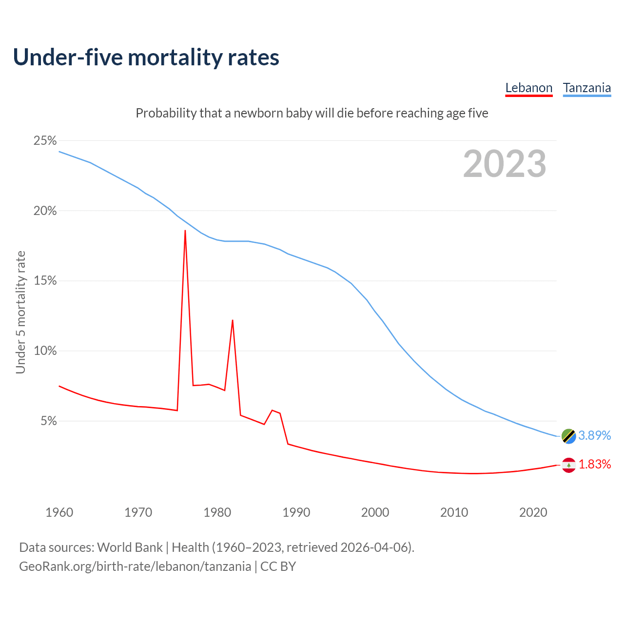 The chance that a newborn baby will die before reaching age five is 1.83% in Lebanon and 3.89% in Tanzania. Above is a chart with historical data on under-five mortality rates.