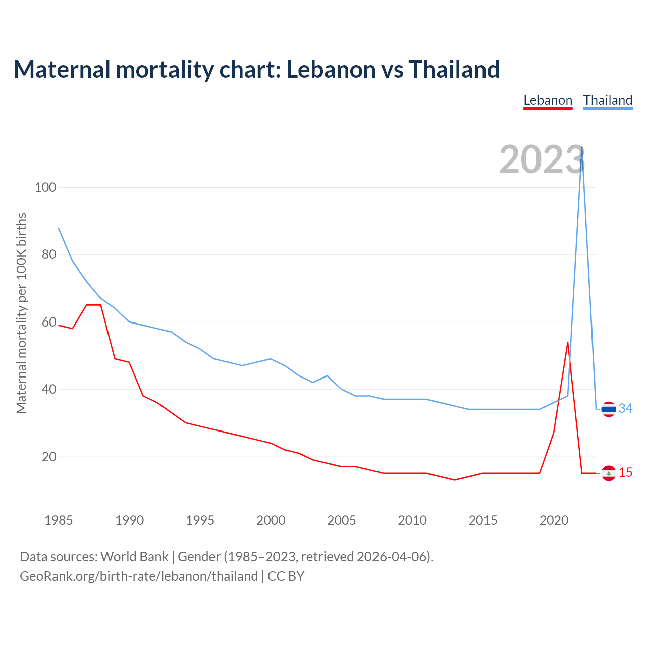 The maternal mortality rate, which is the probability of dying during childbirth or within 42 days of pregnancy termination, is 15 deaths per 100,000 live births in Lebanon, compared to 34 deaths in Thailand.