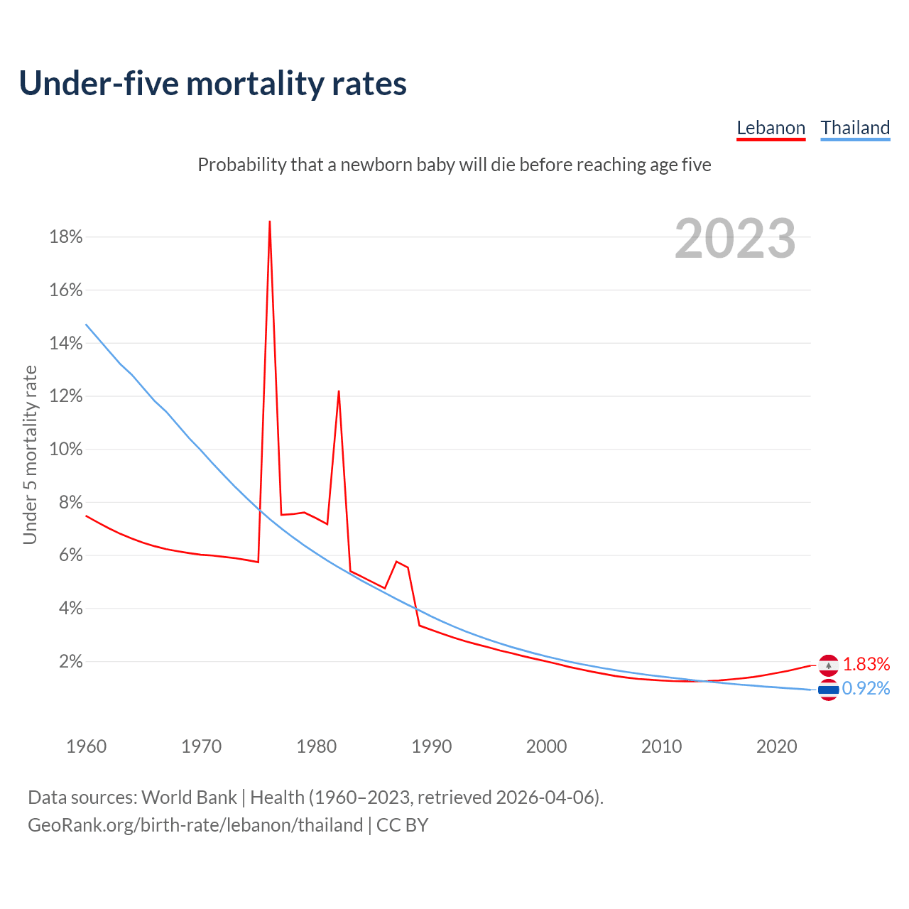 The chance that a newborn baby will die before reaching age five is 1.83% in Lebanon and 0.92% in Thailand. Above is a chart with historical data on under-five mortality rates.