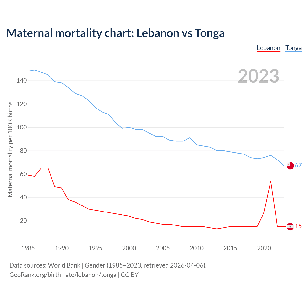 - Annual births per 1,000 women ages 15-19 (adolescent birth rate or teenage mother rate) is 20.8 in Lebanon vs 24.8 in Tonga.