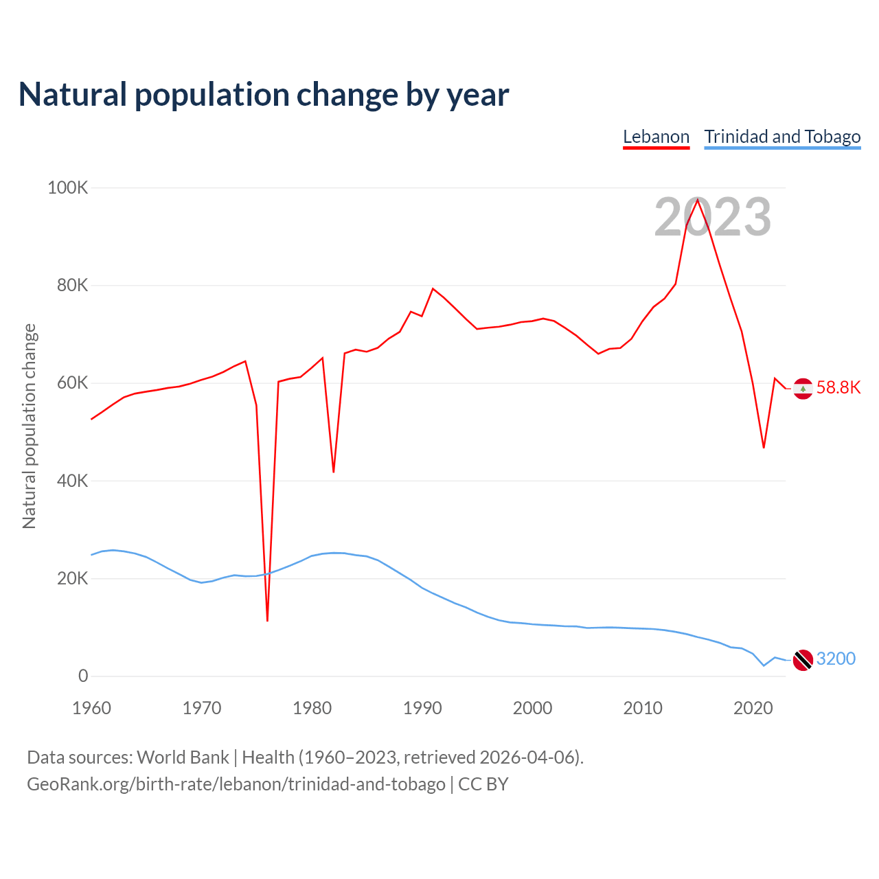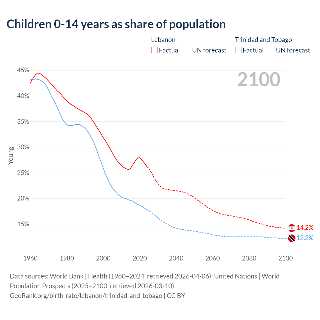 According to the latest available data on birth rates, the fertility rate in Lebanon was 2.24 children per woman in 2023, compared to 1.53 in Trinidad and Tobago in 2023. The replacement level is considered to be 2.1 children per woman.
