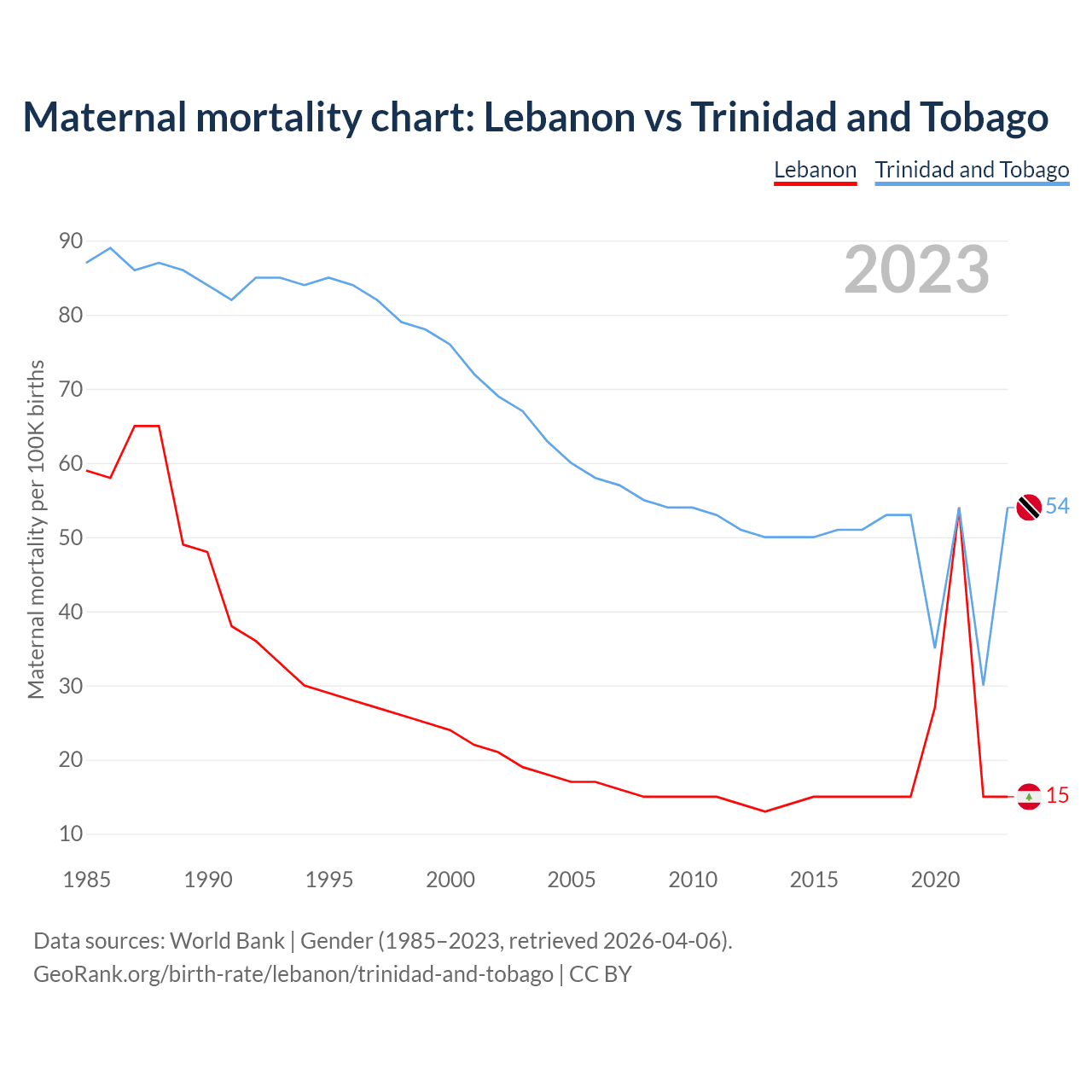 The maternal mortality rate, which is the probability of dying during childbirth or within 42 days of pregnancy termination, is 15 deaths per 100,000 live births in Lebanon, compared to 54 deaths in Trinidad and Tobago.