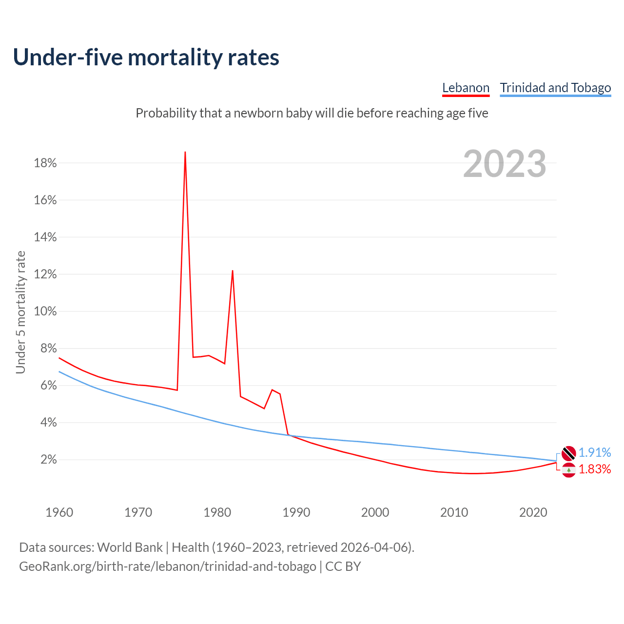 The chance that a newborn baby will die before reaching age five is 1.83% in Lebanon and 1.91% in Trinidad and Tobago. Above is a chart with historical data on under-five mortality rates.