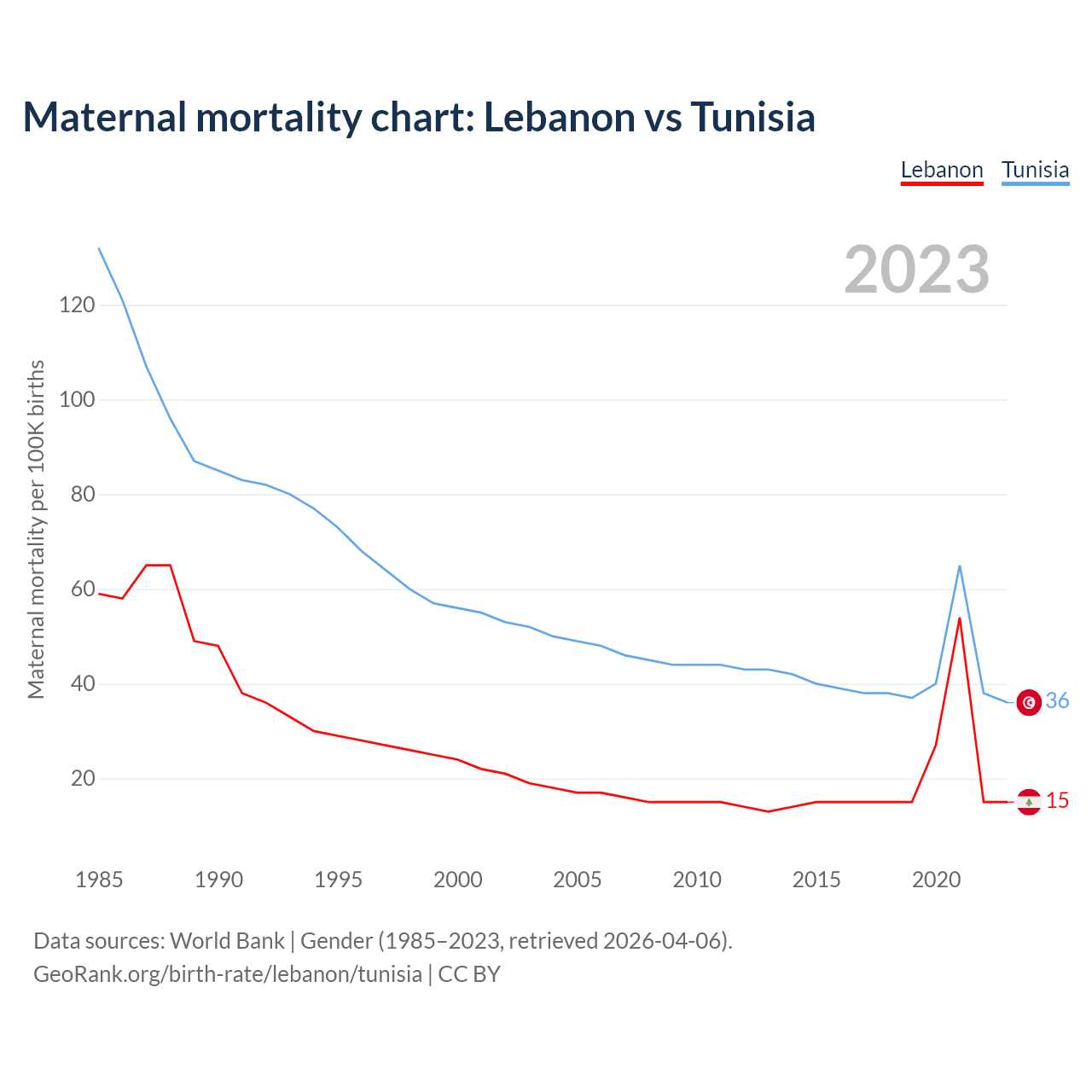 The maternal mortality rate, which is the probability of dying during childbirth or within 42 days of pregnancy termination, is 15 deaths per 100,000 live births in Lebanon, compared to 36 deaths in Tunisia.