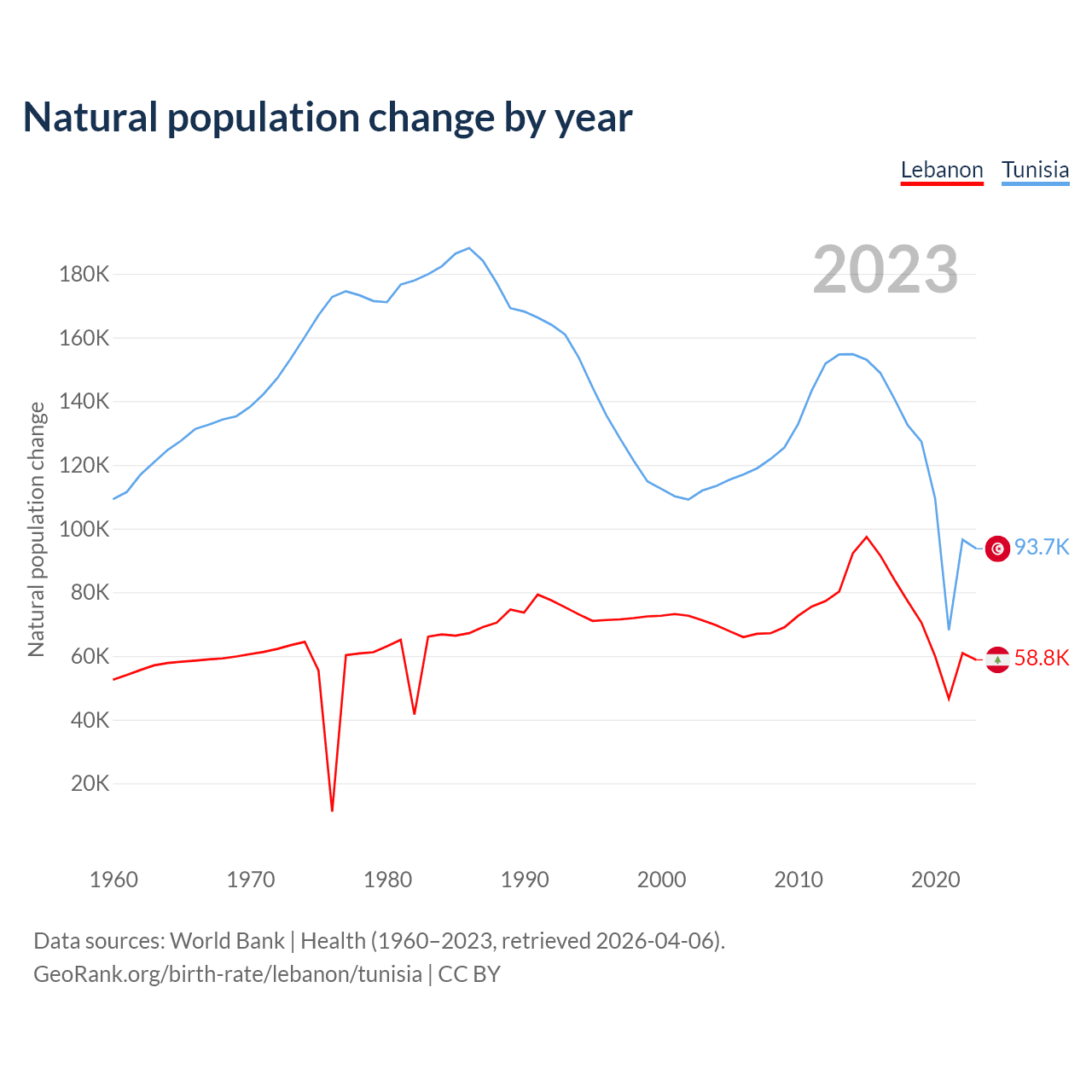 According to the latest available data on birth rates, the fertility rate in Lebanon was 2.24 children per woman in 2023, compared to 1.83 in Tunisia in 2023. The replacement level is considered to be 2.1 children per woman.